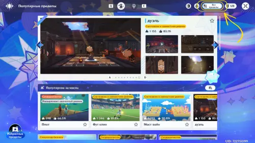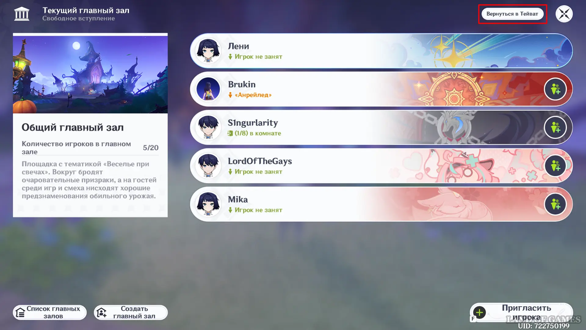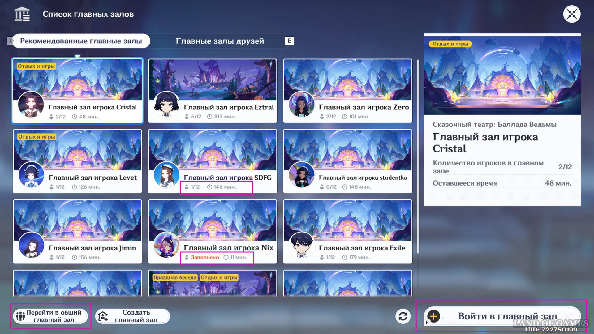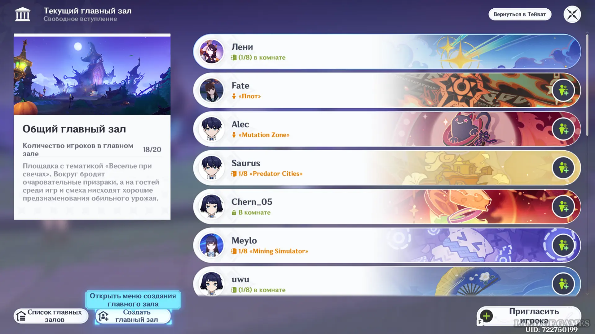 Стандартный способ входа в UGC-режим — кнопка «Главный зал» в нижней части меню Паймон, либо с помощью соответствующей иконки в правом верхнем углу экрана (тогда вы сможете сразу выбрать один из популярных пределов и присоединиться к игре).
