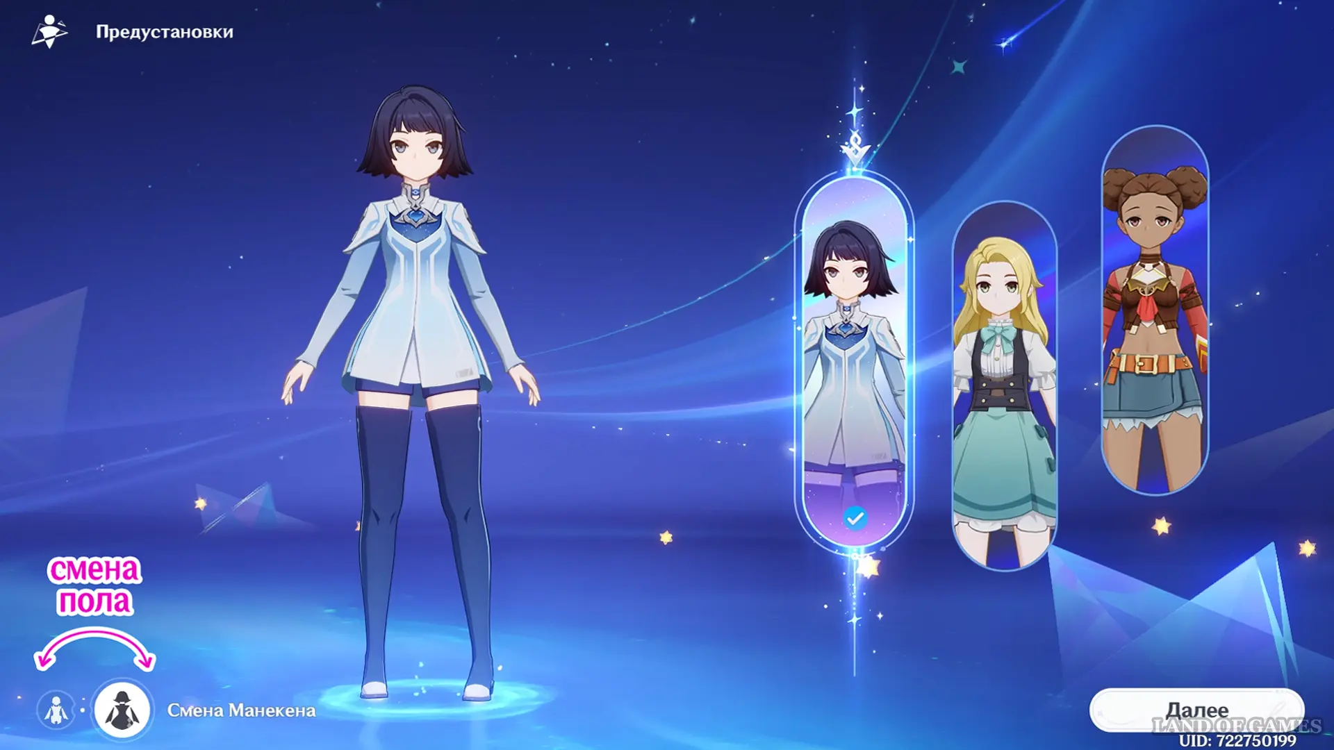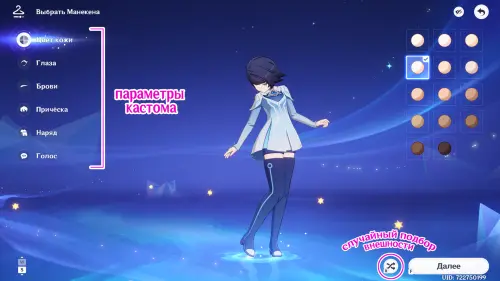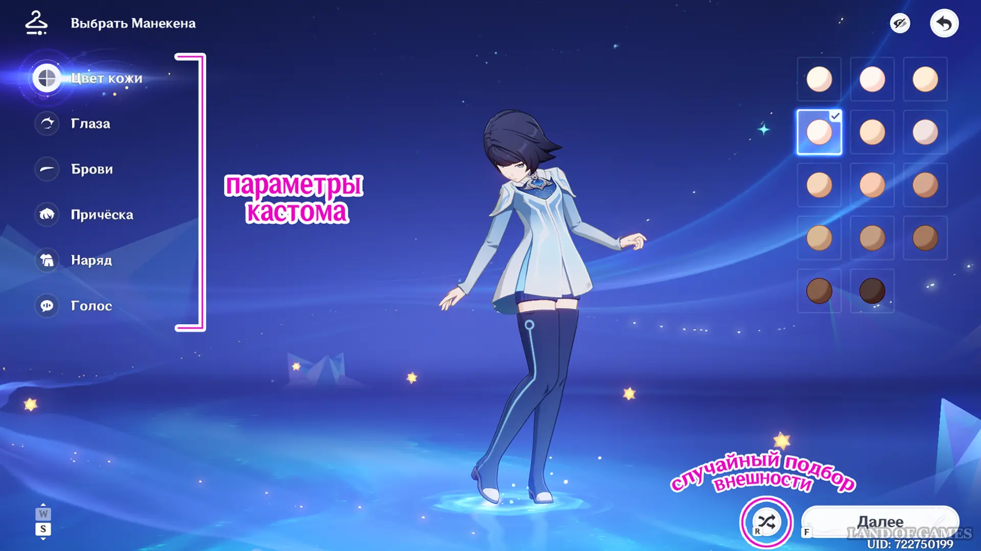 При стартовой настройке любого пола доступен выбор между тремя готовыми образами, выполненными в разных стилистиках. Перейдя к детальному кастому, вы также можете кликнуть по кнопке «R» (стрелочки слева от «Далее»), тем самым сгенерировав рандомный облик из доступных компонентов внешности.