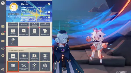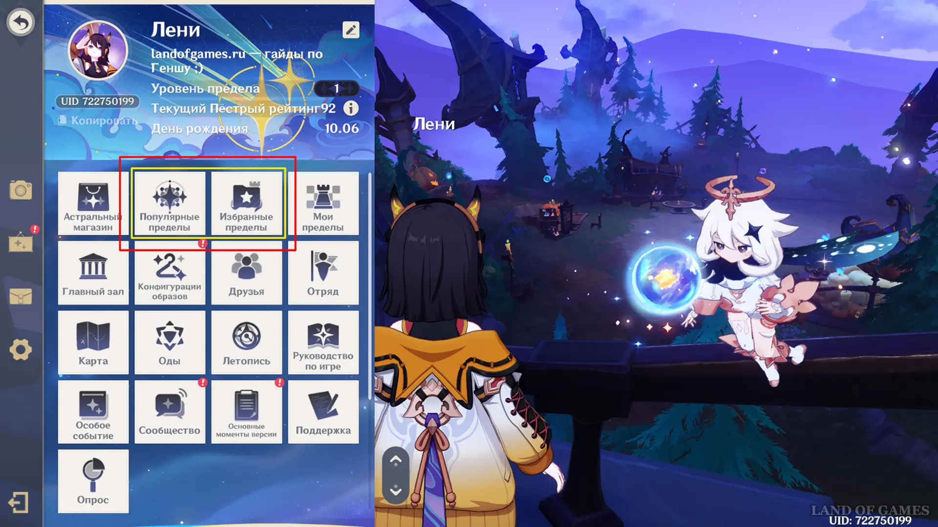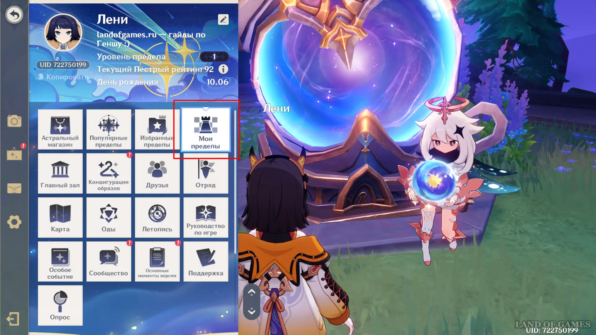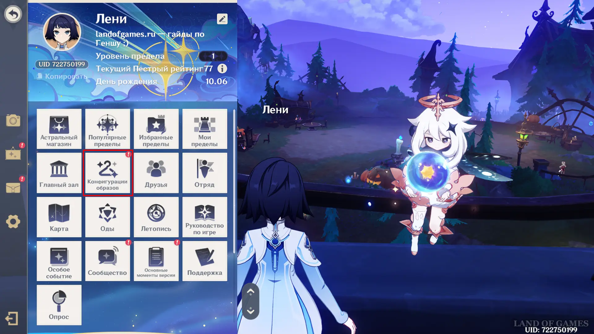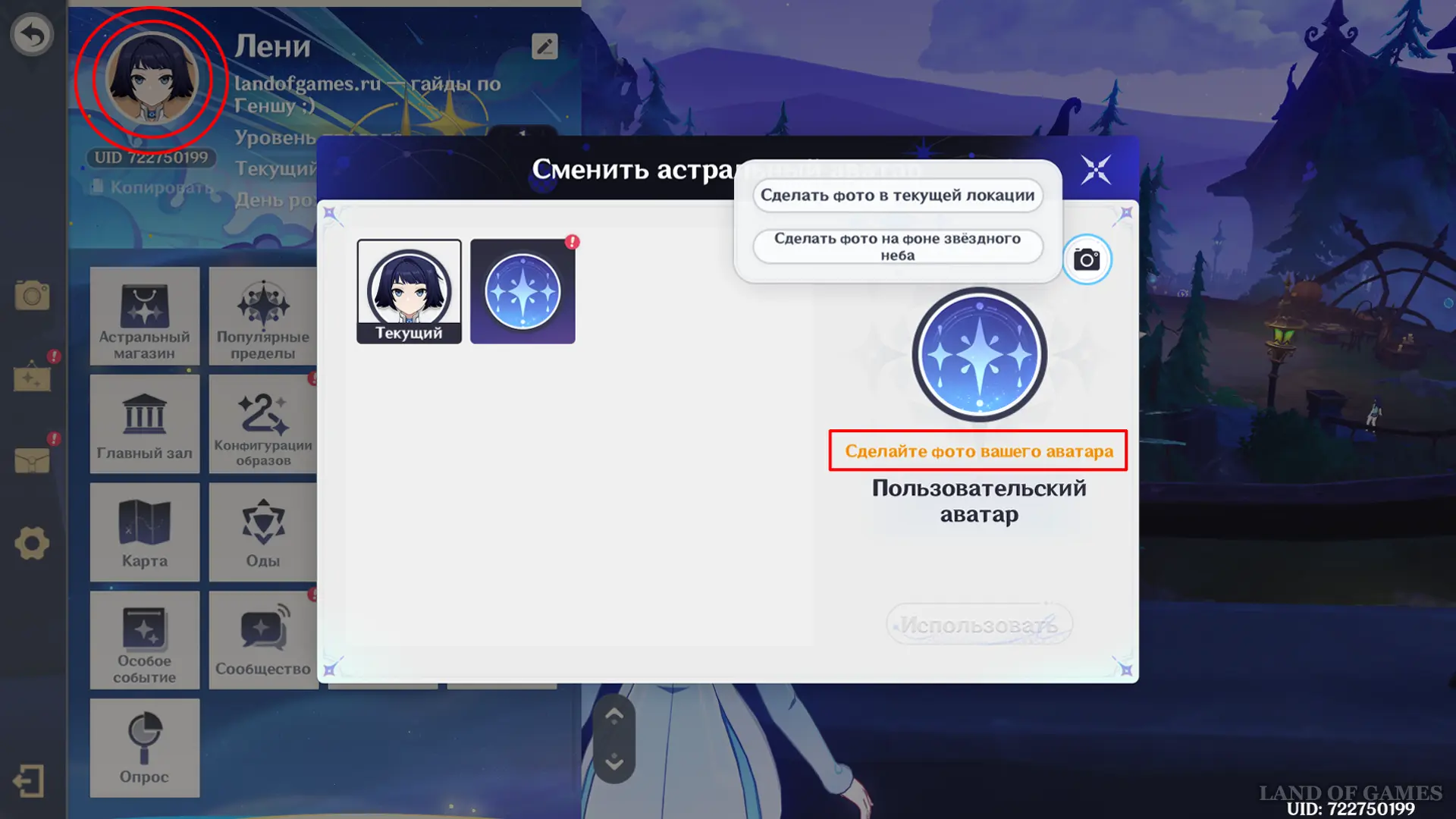 Внутри режима вы сможете не только перемещаться за нового героя, но и настраивать уникальный пользовательский аватар профиля: откройте меню Паймон, кликните по картинке над вашим UID и выберите иконку предела — ее можно заменить на фото с фоном звездного неба или текущей локации.