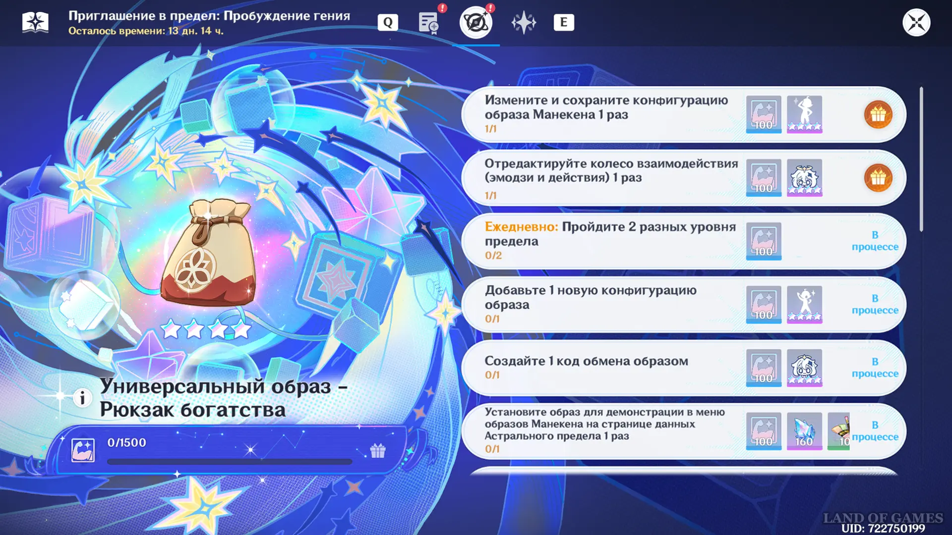 - Задания Исследования пределов и активности Пробуждения гения – повышайте уровень в Астральном пределе, выполняйте поставленные задачи или добивайтесь определенных целей, чтобы получать специальные ларцы, содержащие наряды, части скинов и прочие материалы.