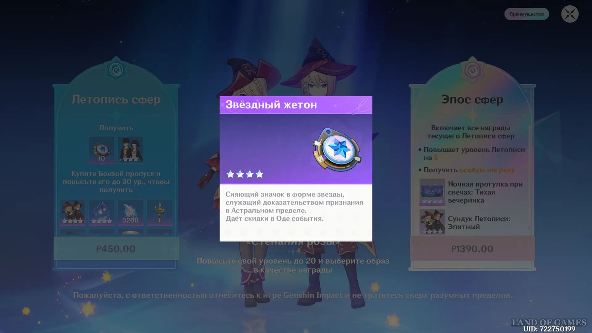 - Звездный жетон – скидочный ресурс, получаемый при покупке БП Летопись сфер. Его применение позволяет сбить цену на крутки ивентового баннера со скинами;