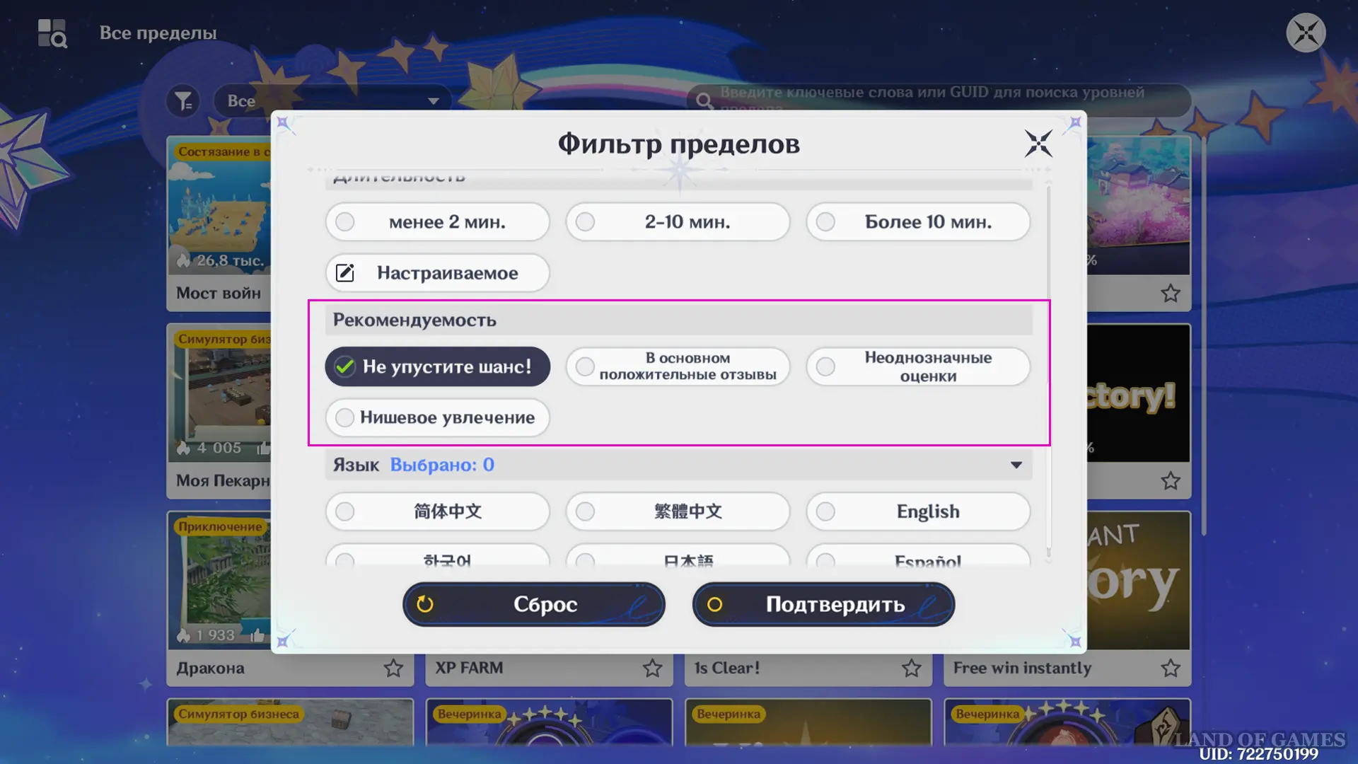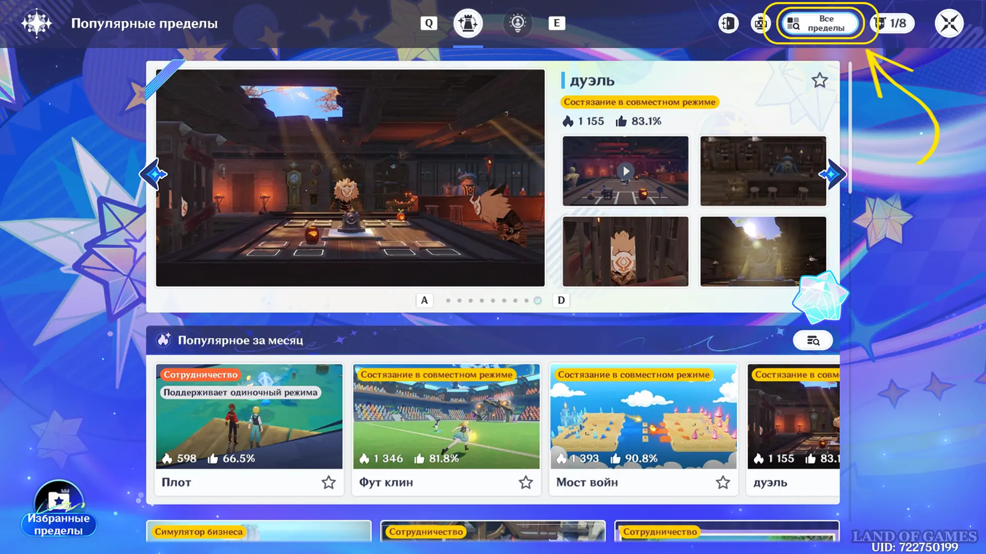 В разделе «Популярных пределов» уже создано немало креативных уровней, удостоившихся положительных оценок от десятков тысяч игроков. На главной странице вы и так увидите самые топовые из них, но для более точной фильтрации перейдите во «Все пределы» (кнопка сверху справа), а далее отсортируйте по жанрам и прочим критериям. Либо поменяйте вкладку контекстного меню с варианта «Все» на «Популярное» или «Популярное за 7 дней».