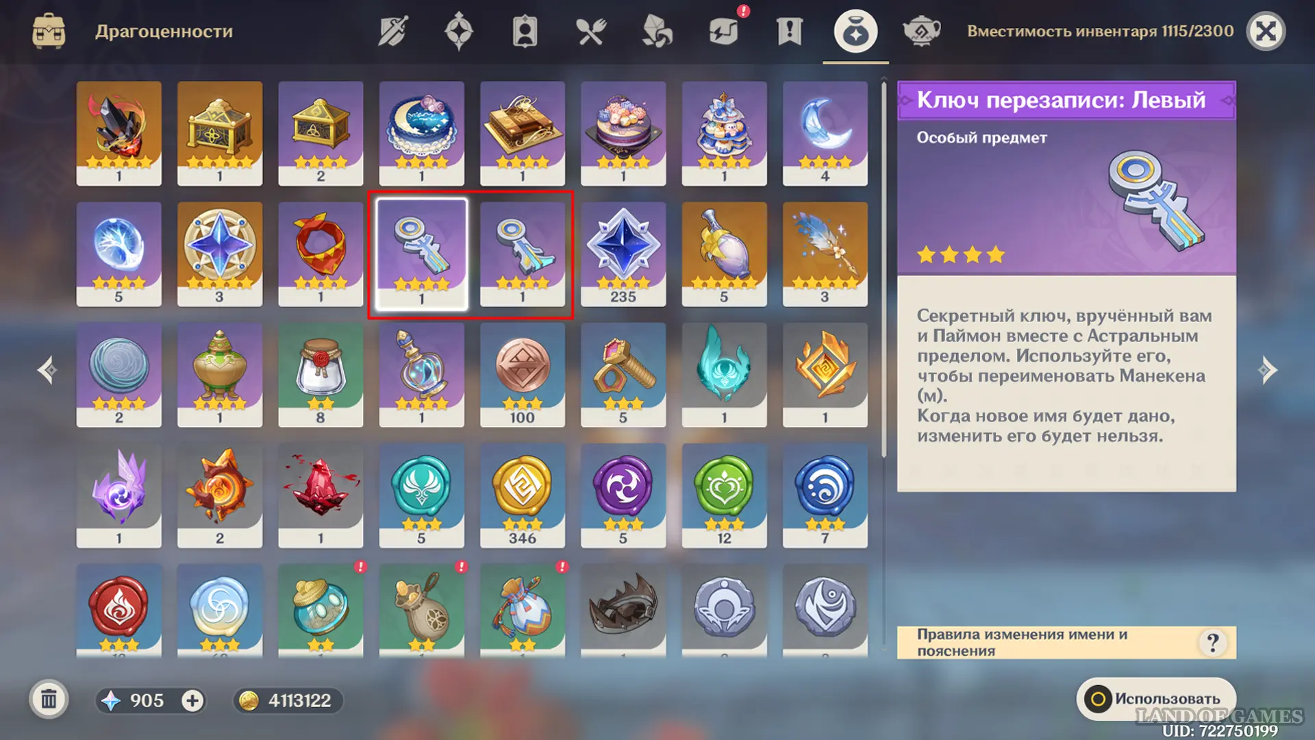 Завершающий этап создания ГГ предела — это выбор имени. Оно будет отображаться при игре в Тейвате и может быть 1 раз изменено при помощи предмета «Ключ перезаписи» (левый для мужской версии, а правый — для женской, лежат среди Драгоценностей в инвентаре).