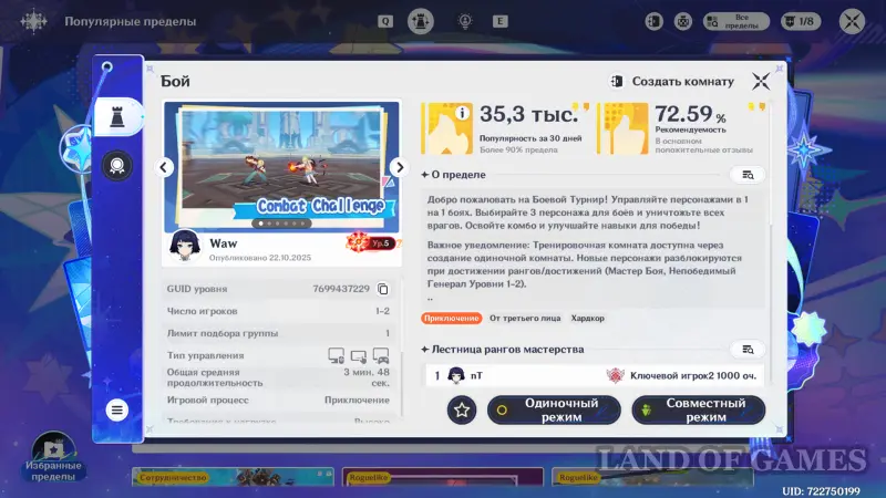 Одним из самых популярных уровней сейчас является Боевой турнир от автора Waw (GUID: 7699437229), в котором реализована давняя мечта многих игроков – ПВП схватки.