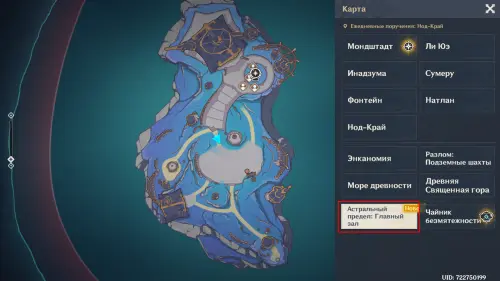 Второй вариант — через карту: открываем навигацию хаба и раскрываем меню с доступными локациями (также по значку здания с колоннами, но в правом нижнем углу экрана), а затем выбираем любой регион Тейвата и перемещаемся в интересующее место, тем самым автоматически выходя из режима.