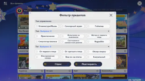 Находясь в Главном зале, перейдите на страничку «Популярные пределы», чтобы увидеть все текущие проекты других игроков и сыграть в них. Здесь имеется проработанный фильтр, позволяющий выбрать тип игр (экшен, рогалик, состязание, шутер и так далее), теги (от 3-го лица, фиксированная камера, казуалки и так далее) и кол-во игроков (для одиночного прохождения или кооператив).