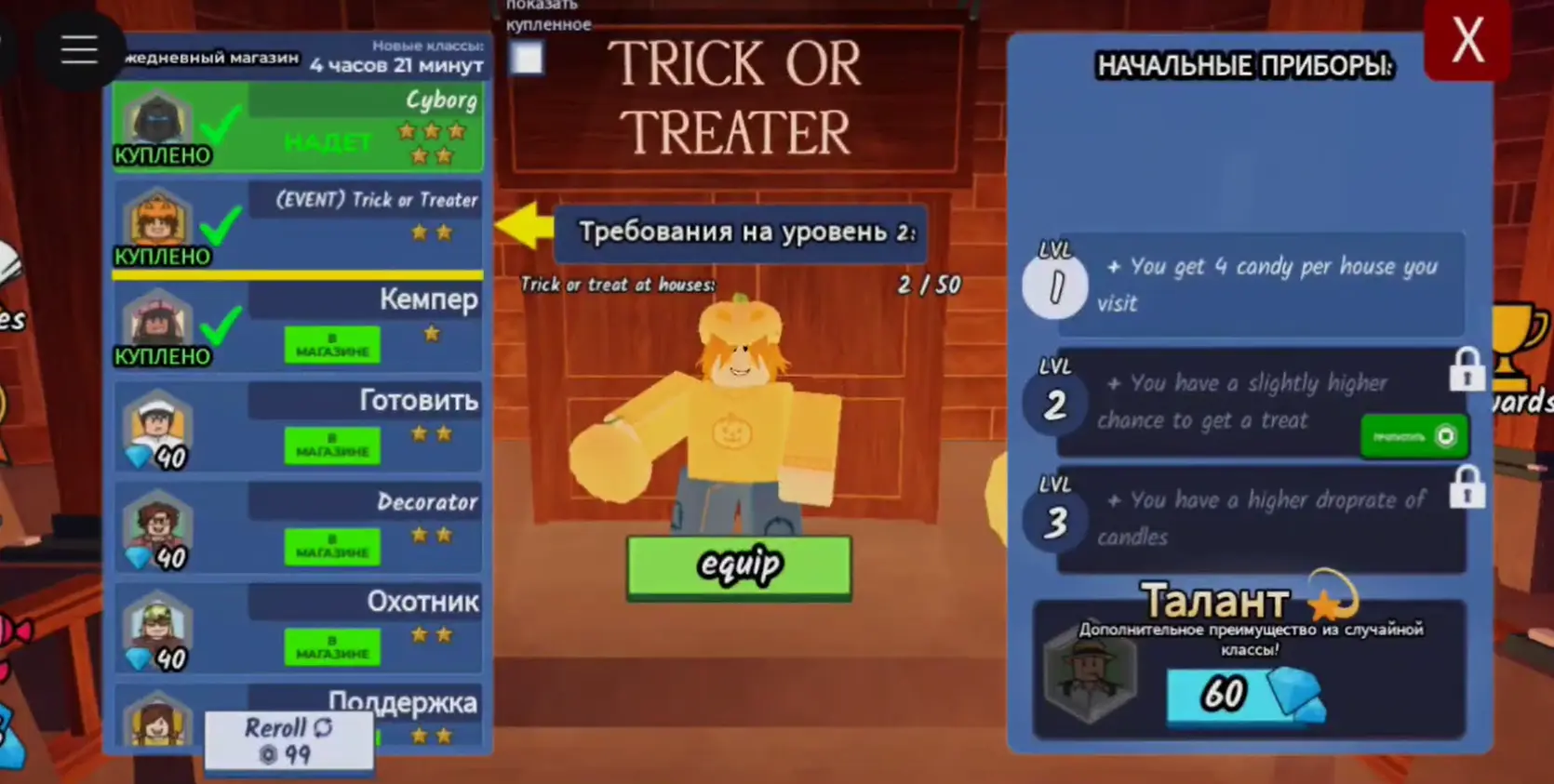 Класс Сладость или гадость (Trick or Treater) – стоимость: 30 конфет; новый класс, который позволяет быстрее выполнять квесты и получать больше конфет за визиты по домам. Обратите внимание на иконку часов: класс временный.