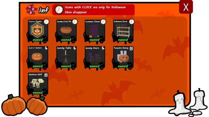 Тыквенный кролик (Pumpkin Bunny) – стоимость: 150 конфет; превращает вашего прирученного кролика в тематического «тыквенного» питомца.
