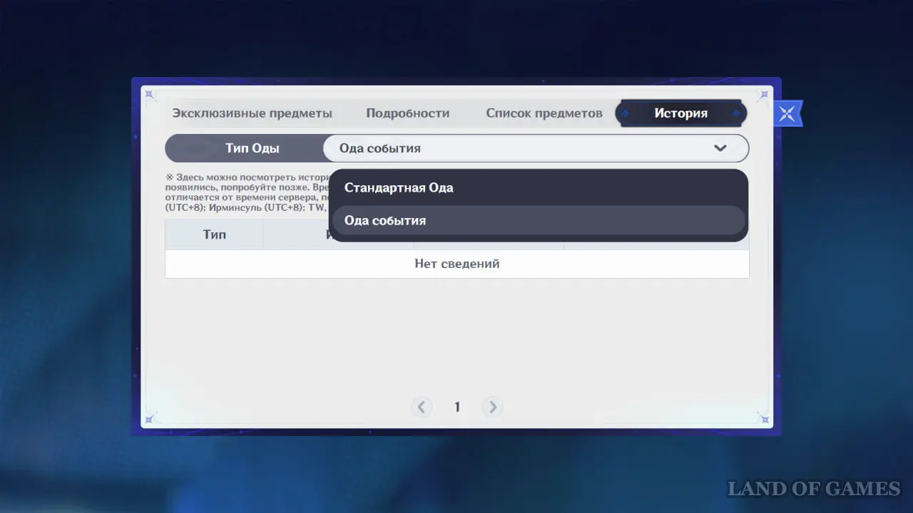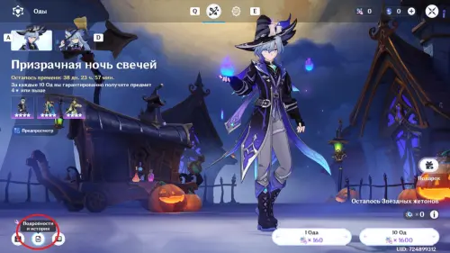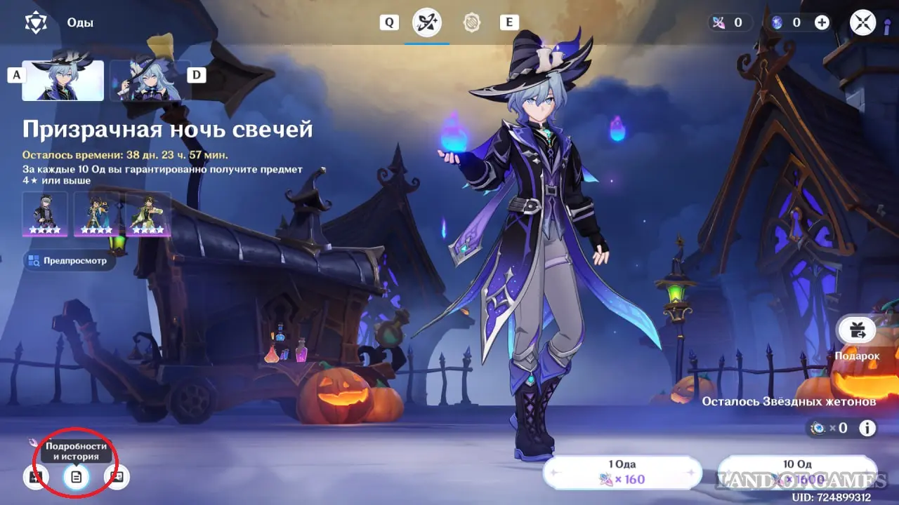 Из меню од, нажав на кнопку в левом нижнем углу экрана, вы можете перейти во вкладку с подробностями текущего баннера и просмотреть историю круток.