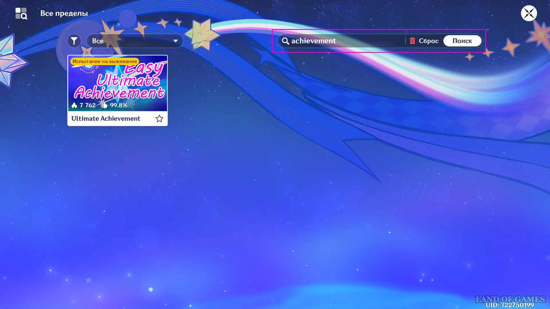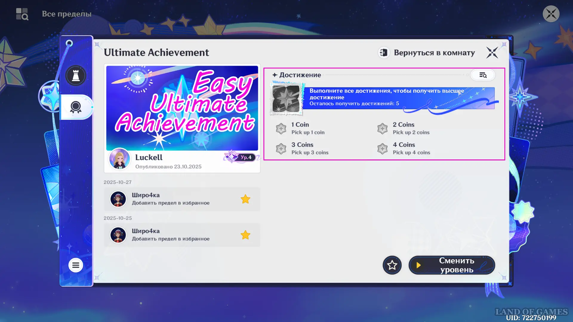 Чтобы упростить выбивание этой цели, вбейте в поисковую строку вкладки «Все пределы» такие слова: «free», «coin», «xp», «easy», «achievement», «fast», «instant». Находимые по этим описаниям уровни максимально просты; в некоторых из них есть ачивки, которые можно получить за несколько секунд.