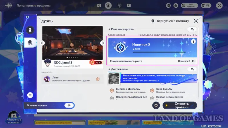 В том же разделе карточки уровня отображается ваше текущее звание. Победы пополняют шкалу ранга, а проигрыши уменьшают накопленный прогресс. Для прокачки участвуйте только в играх, отмеченных как «Состязание в совместном режиме».