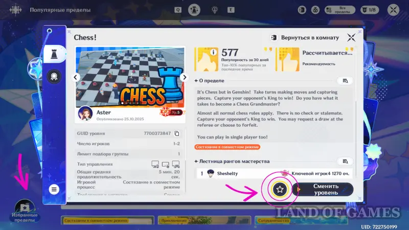 Чтобы добавить уровень в избранное, найдите его в общем списке и нажмите на звезду рядом с кнопкой запуска предела. Позднее их можно просмотреть во вкладке «Избранные переделы».