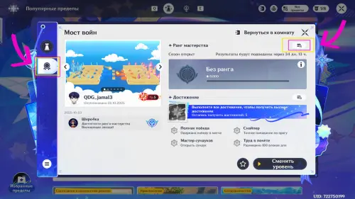 - Войдя в локацию хаба (Главного зала) → выберите изображение книги со звездой на панели сверху («F1» для ПК);