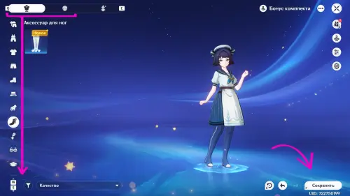 Зайдите в область стилизации «Конфигурации образов» (доступна через меню Паймон или значок вешалки), внесите правку в текущий наряд и сохраните обновленный образ.