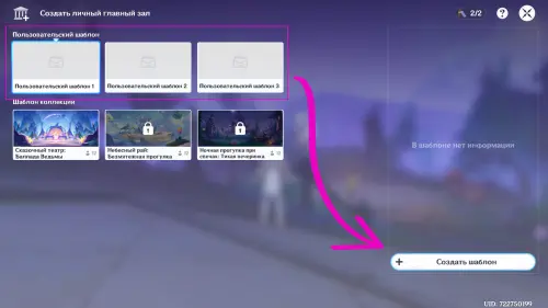 Откройте вкладку хаба (первый скриншот выше) и в левом нижнем краю страницы выберите «Создать главный зал». В появившемся окне кликните на любой пустой шаблон пользователя, а далее воспользуйтесь кнопкой «Импорта и редактирования». В прогрузившейся строительной локации поставьте любой доступный декор и сохраните результат (на иконку дискеты наверху).
