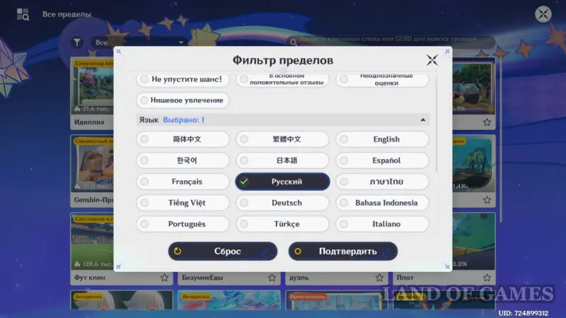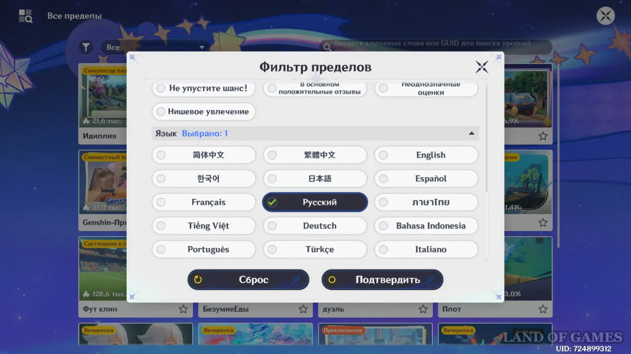 Для этого из меню с популярными пределами зайдите во вкладку «Все пределы». Там используйте кнопку фильтра и промотайте вниз, к выбору языков. Отметьте русский, затем нажмите «Подтвердить». Теперь вы сможете просмотреть все карты с нужной локализацией.