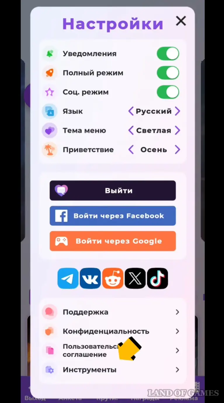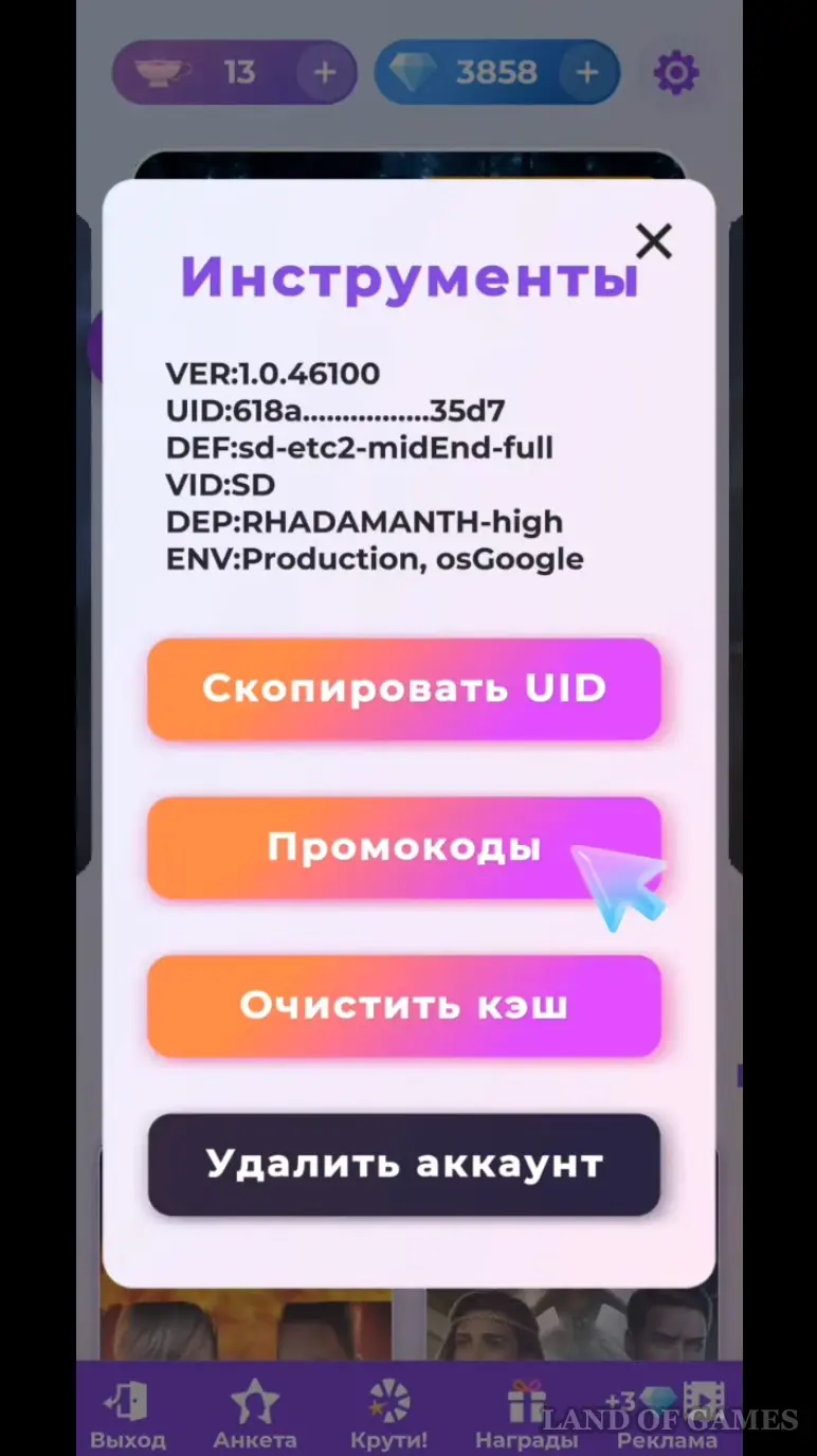 - В появившемся окошке перейдите в раздел «Инструменты», нажав на кнопку внизу. Здесь кликните на кнопку «Промокоды», а затем введите в возникшее текстовое поле один из вышеуказанных промокодов и нажмите на клавишу «Enter».