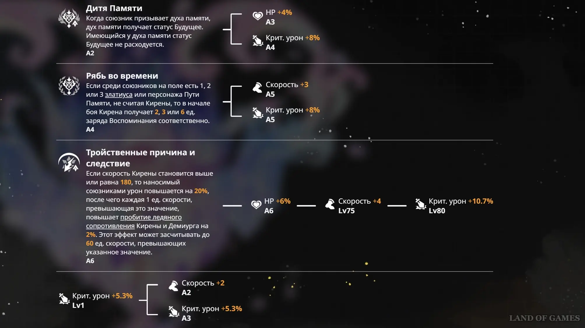- Рябь во времени – если среди союзников есть 1/2/3 златиуса или персонажа Пути Памяти, не считая Кирены, то в начале боя Кирена получает 2/3/6 зарядов Воспоминания.