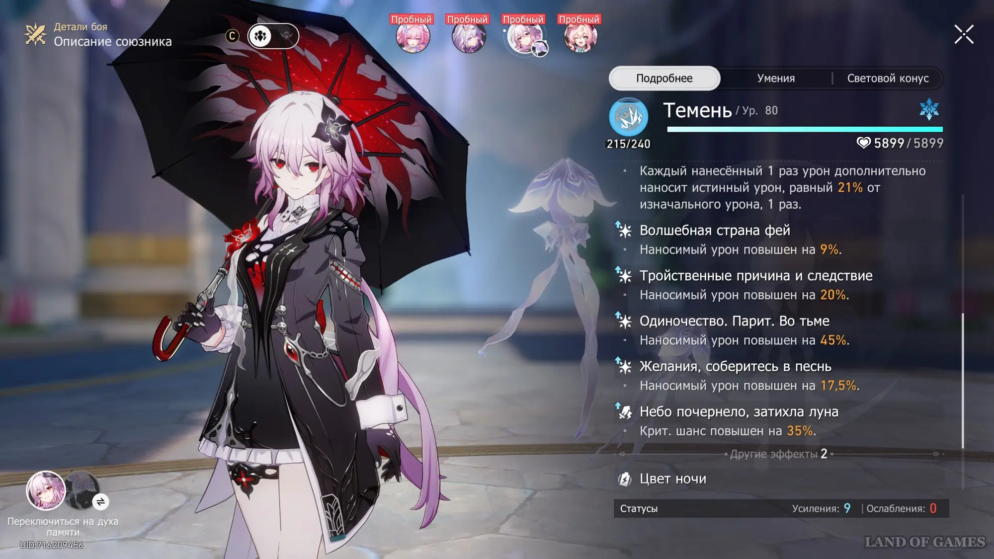 2 части: когда число членов команды на поле битвы не равно 4, каждый лишний или отсутствующий союзник увеличивает наносимый владельцем и его духом памяти урон на 9% и 12% соответственно. Этот эффект может суммироваться до 4/3 раз. | Может стать неплохой альтернативой предыдущим вариантам в команде, которая полностью состоит из персонажей пути Памяти, ведь в этом случае количество лишних членов отряда превысит 4 штуки, что позволит получить максимальный бафф. |