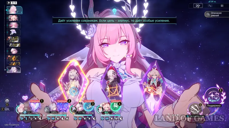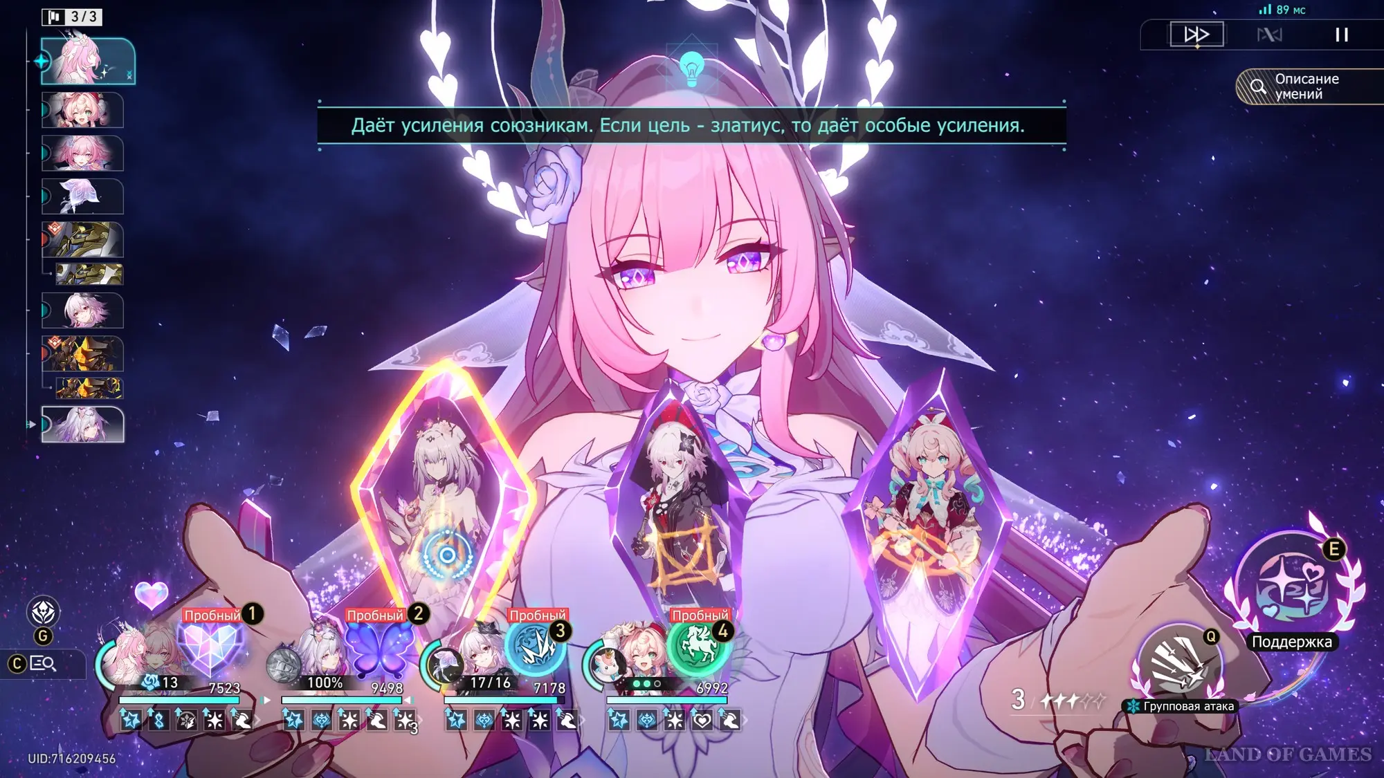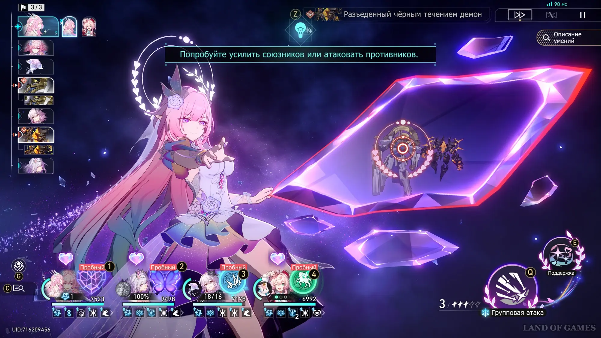 - Перед боем постарайтесь активировать технику Кирены, чтобы после начала сражения сразу активировать зону от навыка, позволяя союзникам наносить истинный урон.
