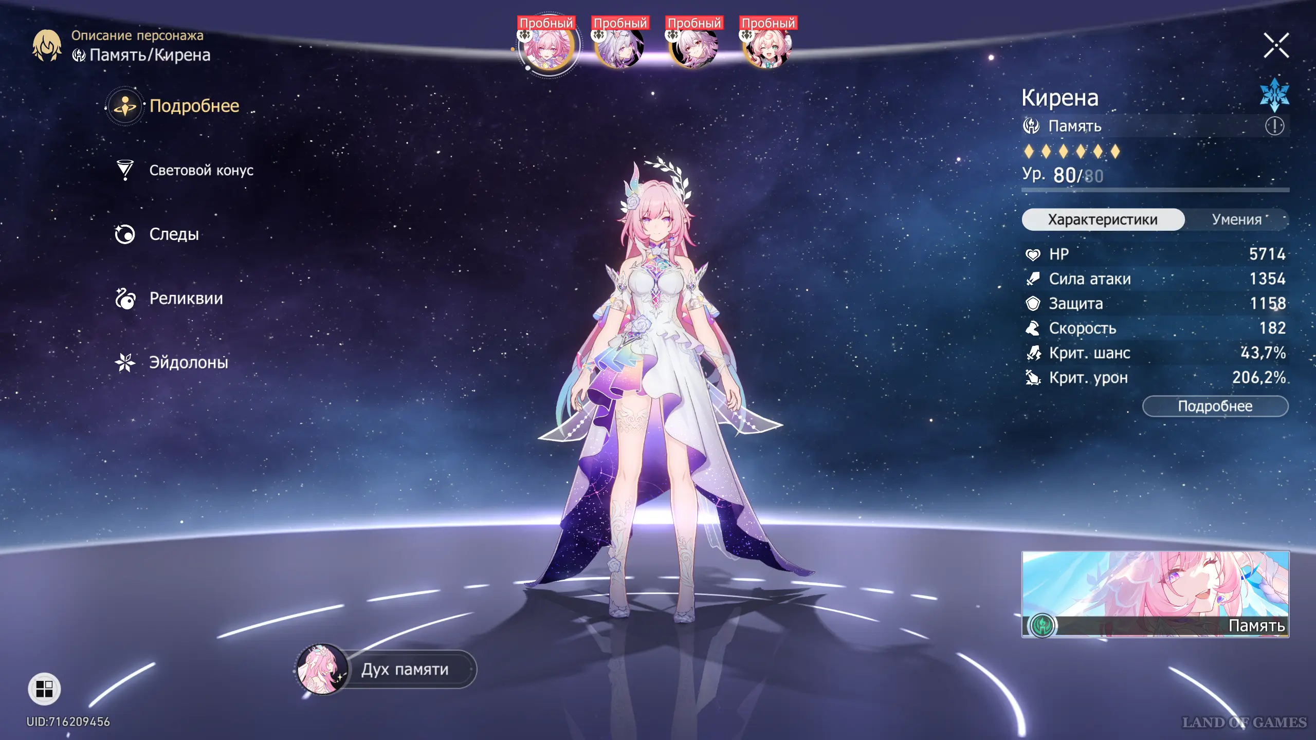 Если вы планируете выбивать эйдолоны и у вас ограничен бюджет, то вполне можете остановиться на Е1 и Е2, которые заметно ускорят накопление зарядов, позволяя героине быстрее призвать духа памяти, а затем активировать ульту, и дадут дополнительные баффы союзникам и самой Кирене. Если же у вас стоит выбор между сигнатуркой и первым эйдолоном, то мы все же советуем взять световой конус, так как для героини сейчас практически отсутствуют хорошие альтернативы.