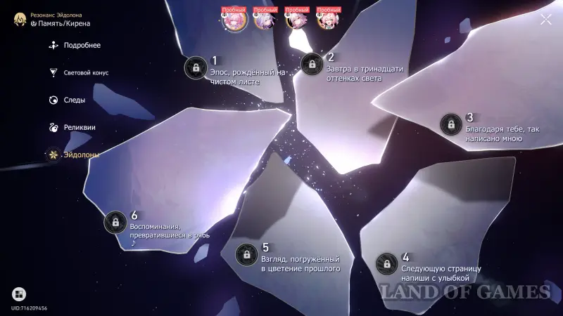 | Воспоминания, превратившиеся в рябь | Первое использование сверхспособности Кирены продвигает действия всех союзников вперед на 100%. Каждый раз, когда Демиург активирует навык духа памяти Ода истинной себе и использует умение Танец цветов и стрел, она дает следующие эффекты в зависимости от того, сколько раз уже сработал этот эффект: 1 раз: пока Демиург находится на поле, защита всех противников понижается на 20%; Минимум 2 раза: действия всех союзников продвигаются вперед на 24%. | Е6, разумеется, хорош, однако не на столько, чтобы тратить на его открытие столько времени и ресурсов, так как бонусы откровенно слабые для 6-го эйдолона. |