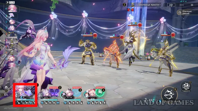 Отметим, что ее критический урон, шанс критического попадания и насмешка составляют 50%, 5% и 100 (100) единиц соответственно на любом уровне, а как таковой запас энергии отсутствует, так как для применения ульты нужно набирать особые заряды.