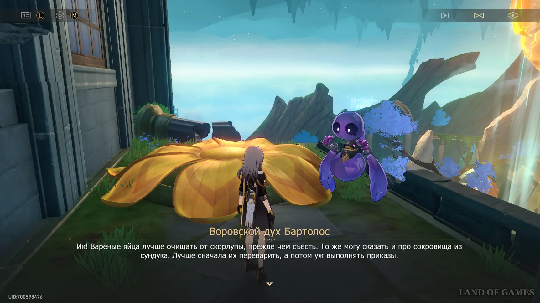 Далее выходим через арку справа, сразу же поворачиваем влево и бежим меж коробок к концу тропинки — тут находится контейнер с ихором, кликнув на который, мы встретимся с Бартолосом. Заговорите с вором и попросите его о помощи, чтобы получить доступ к цветку-подъемнику, награде в размере 40 нефритов + 60 амброзии, а также ачивке «Коварство, время и семя».