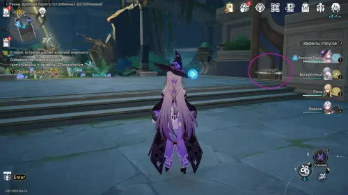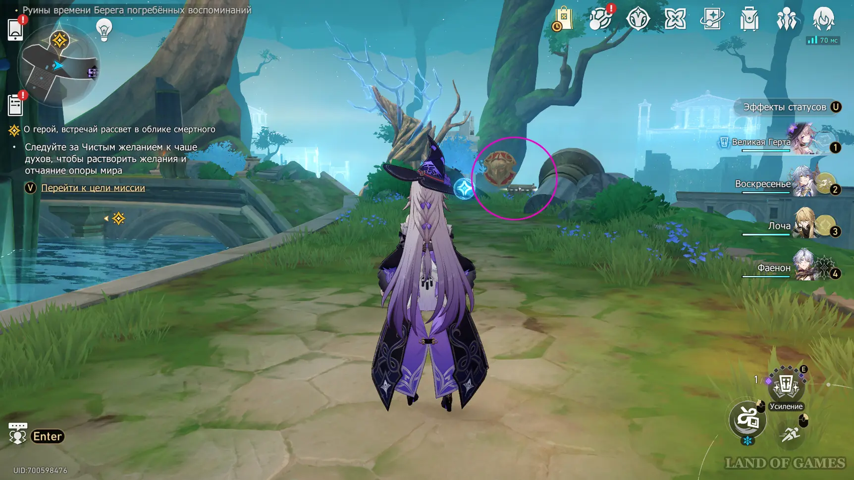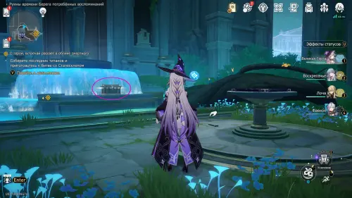 Добегаем по ветке дерева к месту сюжетной встречи с Керидрой и Гисиленсой — здесь есть декоративный фонтан, перед которым нам оставили уже 13-й обычный сундучок.