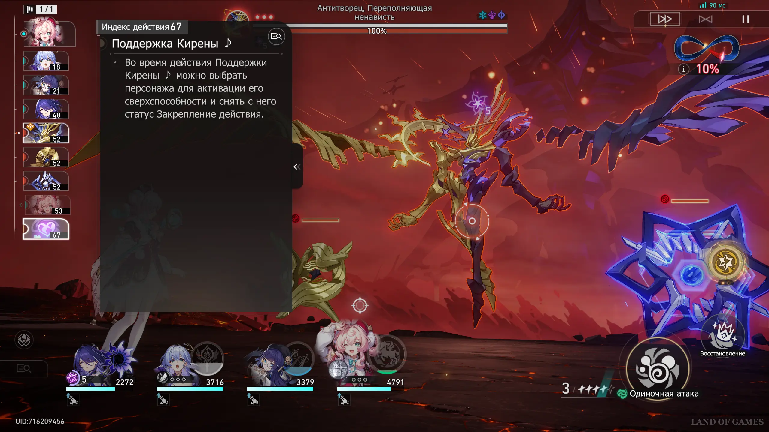 Жизнь и смерть как два цветка на одном стебле – Используйте сверхспособность союзника Кастория «Вой погибели, звон к воскрешению», когда Новое цветение равно 200%. Тоже можно получить в презентации талантов Кирены. Активируйте ее ульту и примените бафф на Кастории, а затем продолжайте сражение, тратя и восстанавливая здоровье персонажей, чтобы довести запас энергии Кастории до 200% и только после этого примените ее ульту.