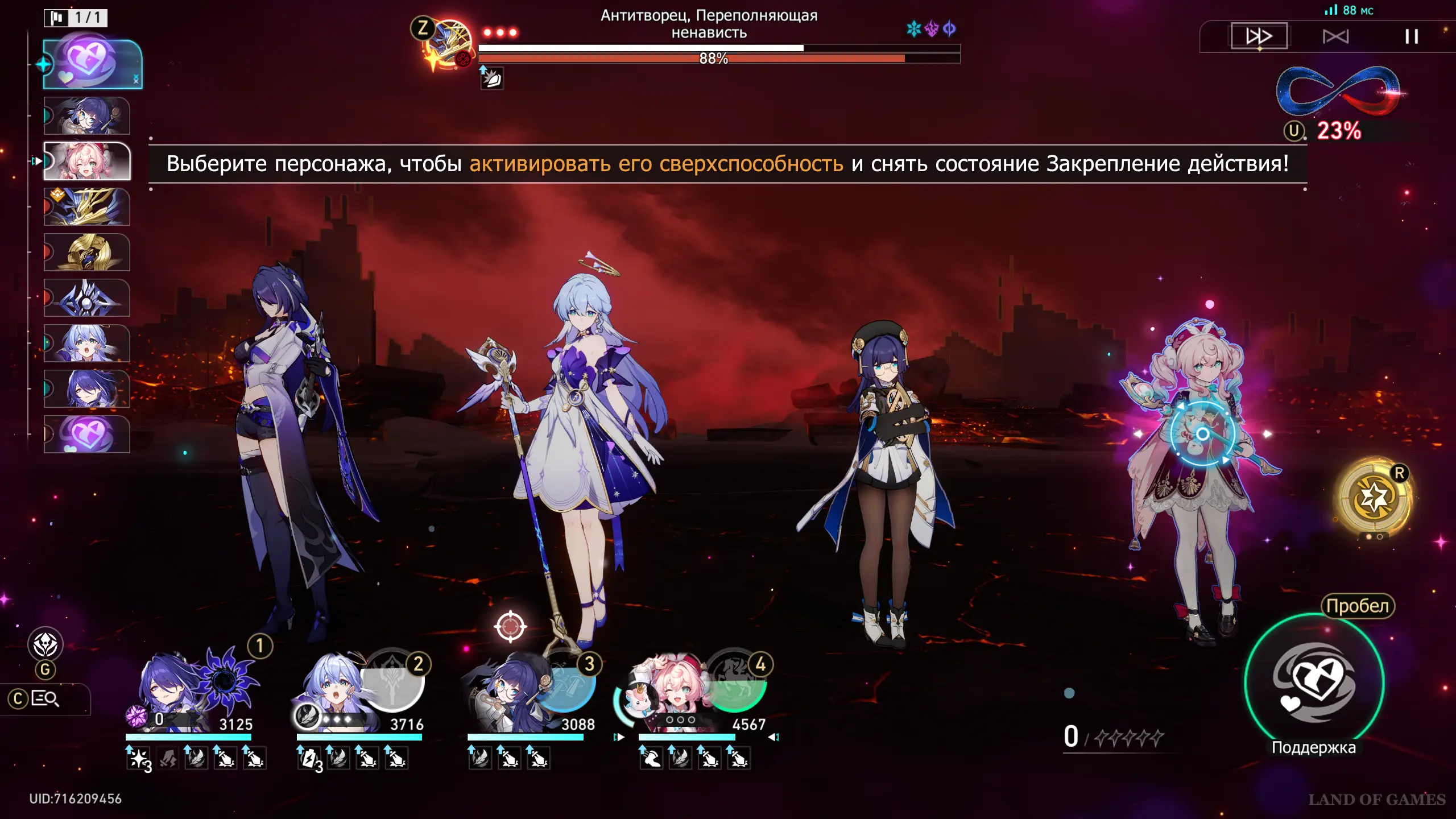 Амфореусу – Запустите 5 различных реплик поддержки во время сражения с противником «Антитворец, Переполняющая ненависть» с помощью Поддержки Кирены ♪. Ачивку можно открыть в Эхе Войны «Ржавая могила железных останков». Ждите, когда будет активирована поддержка Кирены (выделена сердцем в панели порядка действий), а затем выберите любого златиуса в команде. Сделать так нужно 5 раз, причем необходимо выбрать 5 разных персонажей, то есть драться с боссом придется, как минимум, дважды. Можете использовать персонажей друзей, если у вас недостаточно собственных героев Амфореуса.
