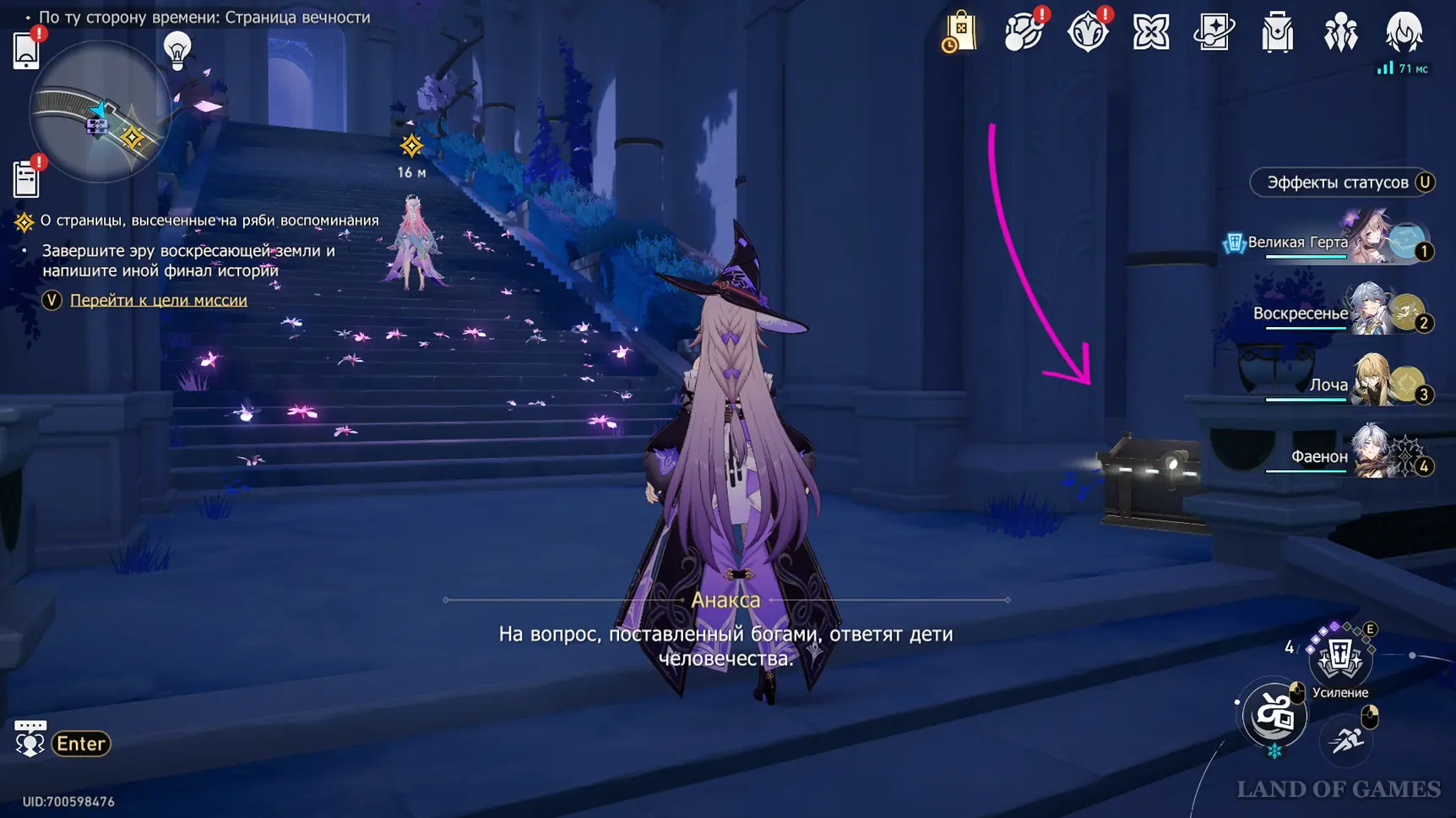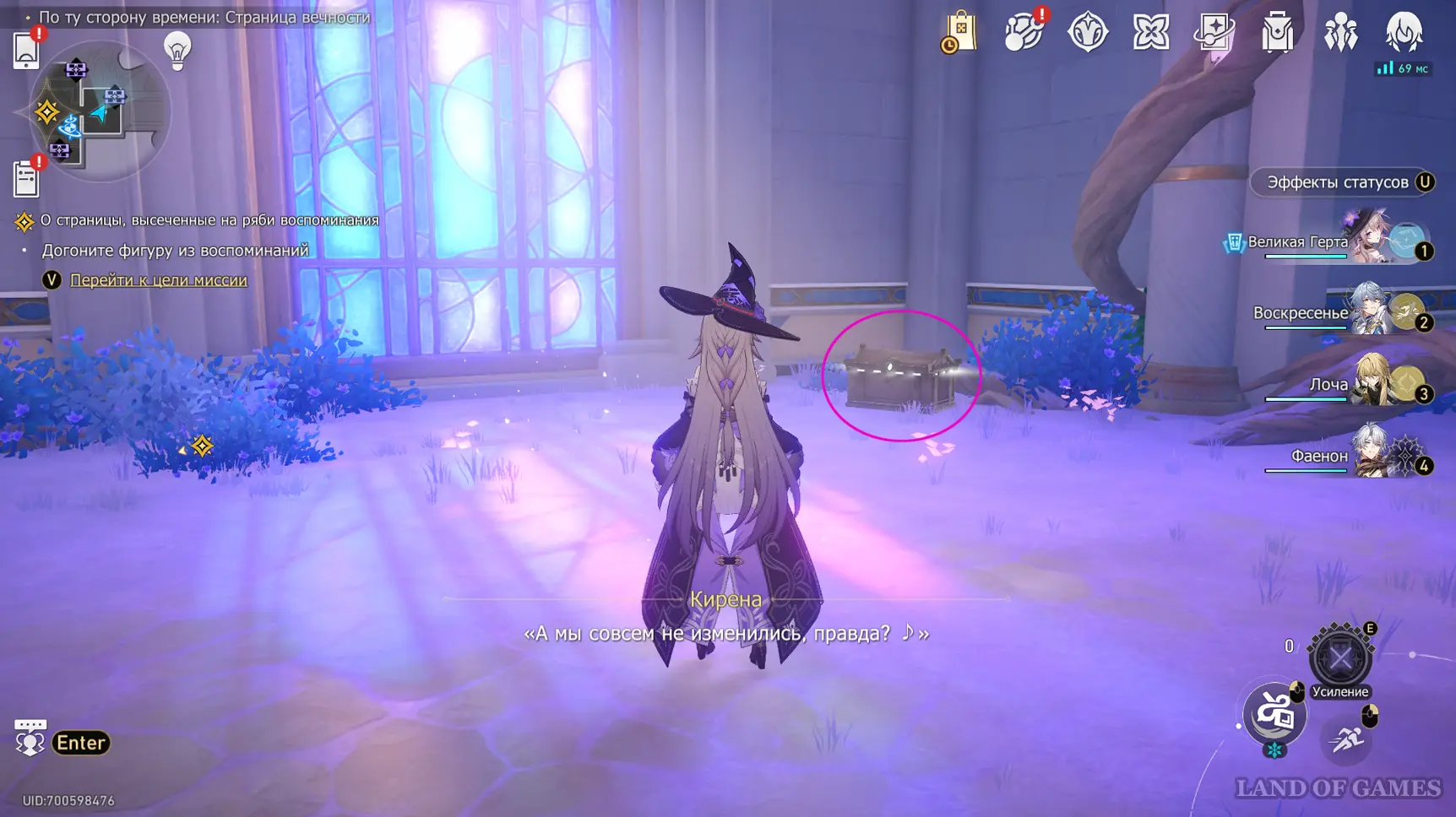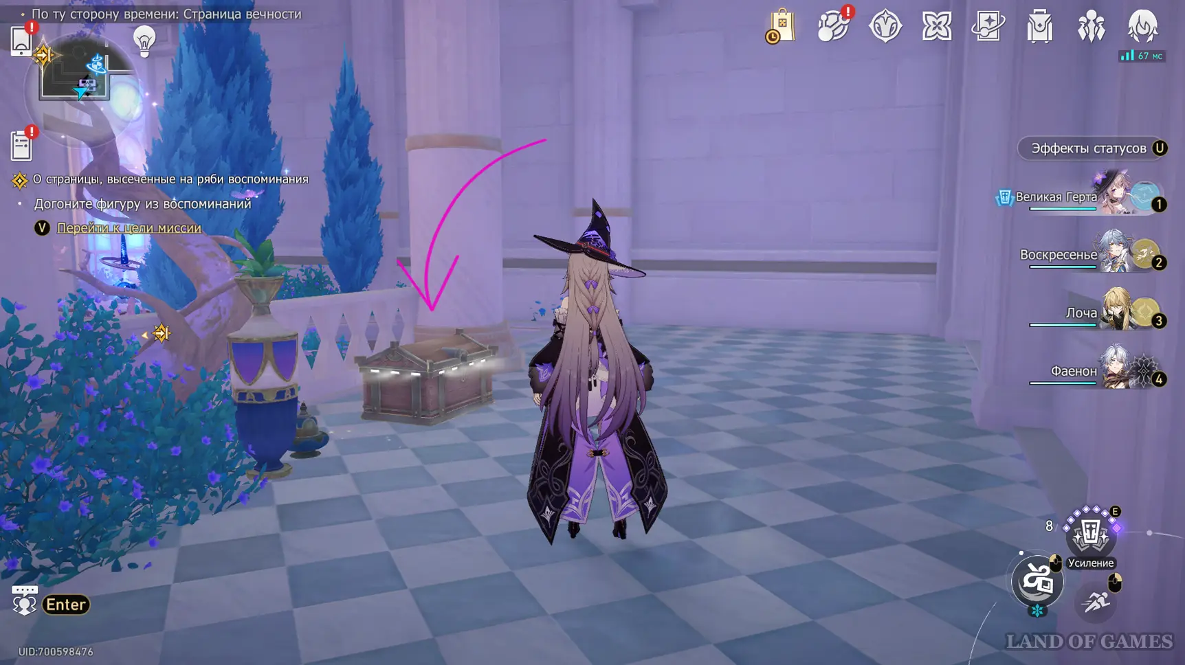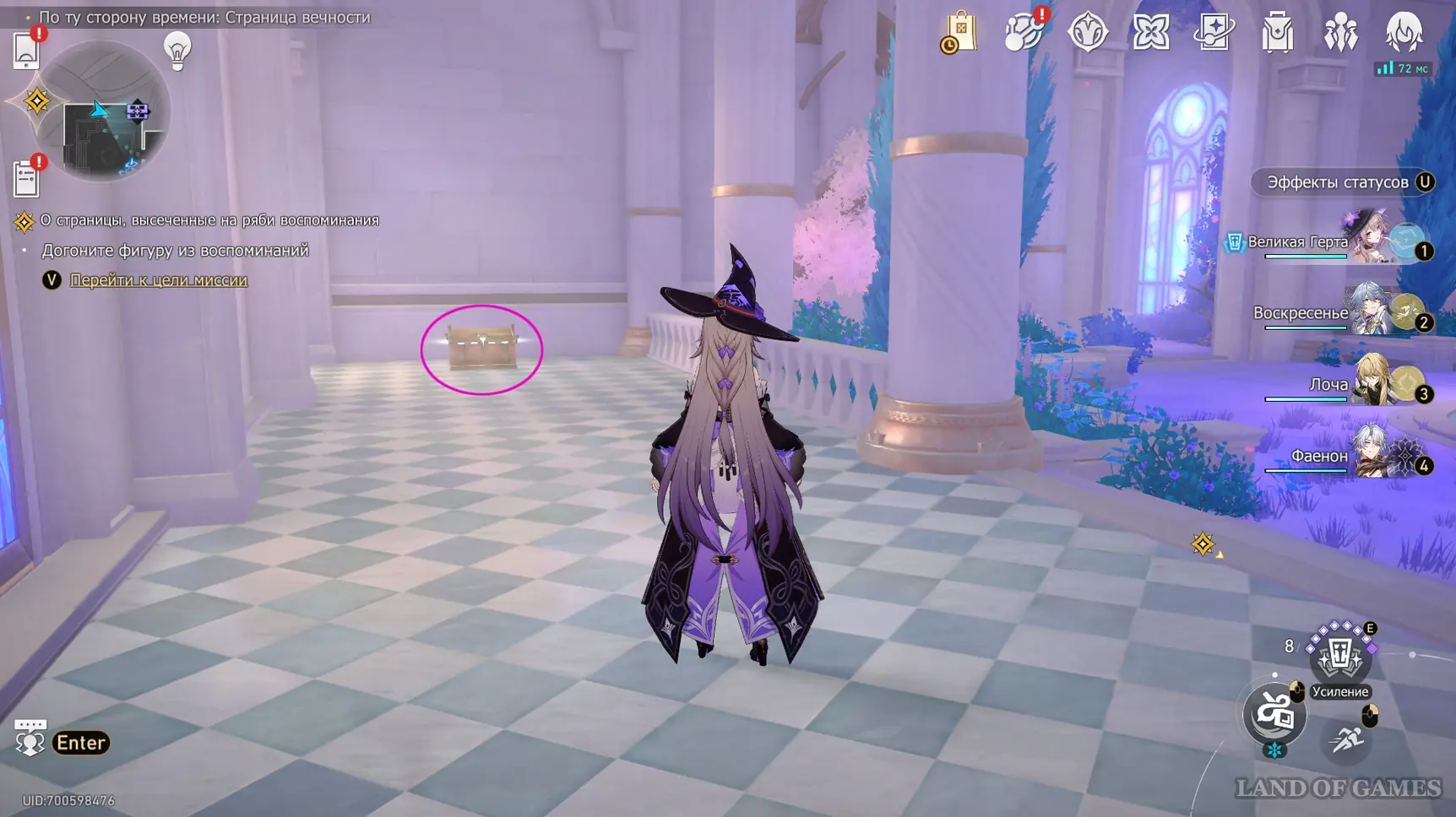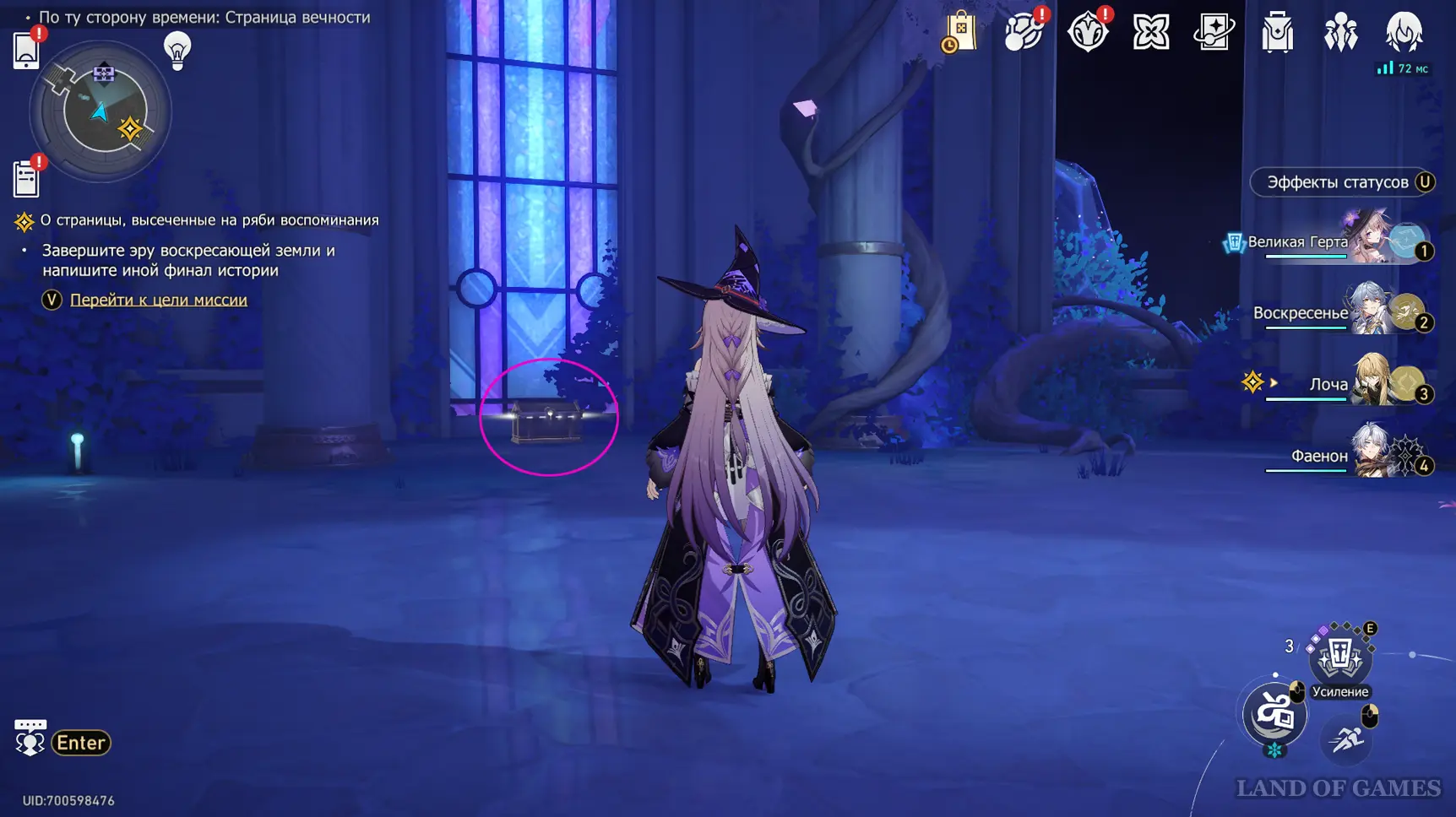 Последний ларец находится в темном помещении с витражными окнами по центру знака бесконечности (форма локации через навигацию) — соберите его, чтобы завершить поиск всех сокровищ Страницы вечности.
