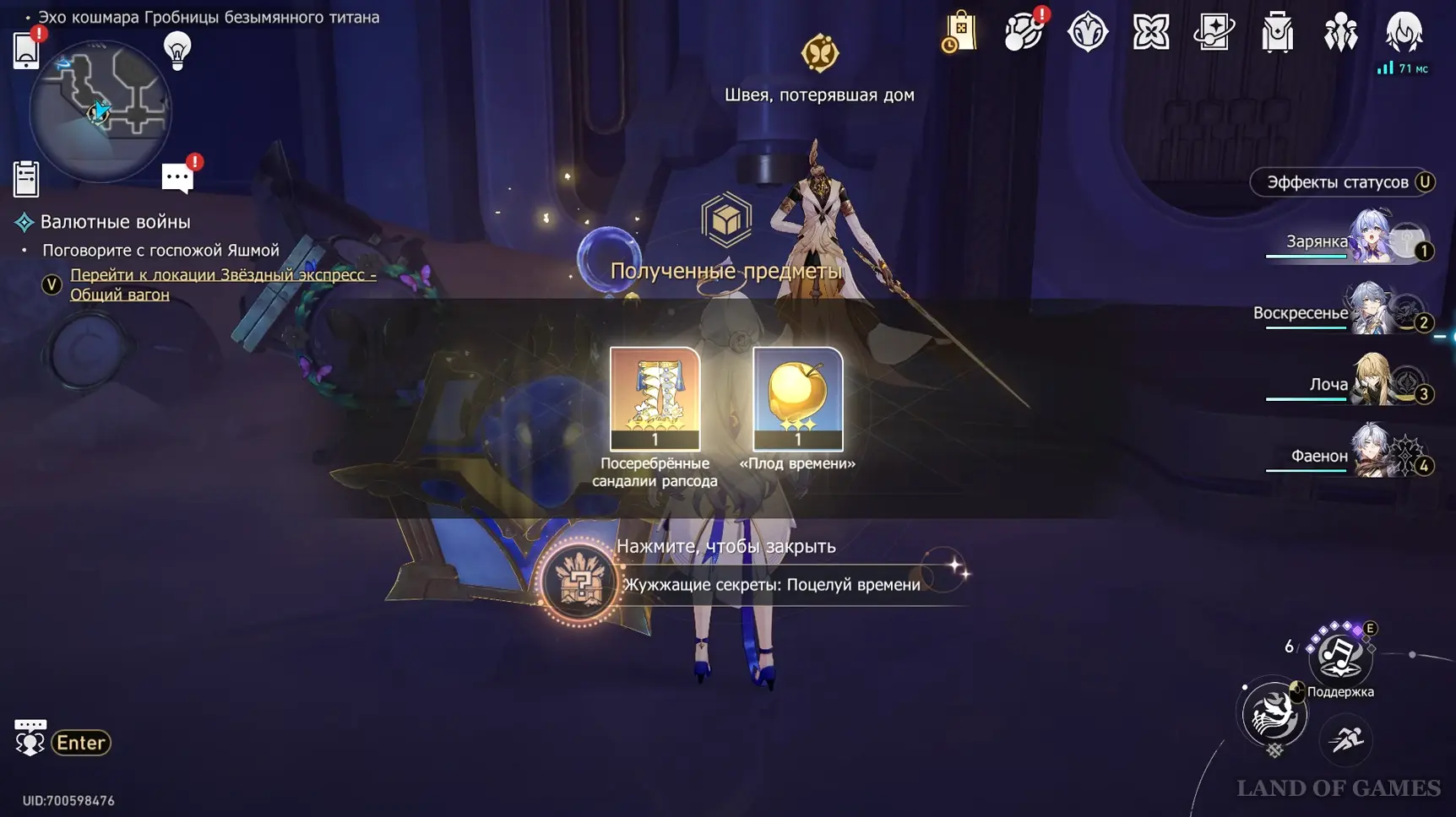 Швея подметит, что упомянутый меч принадлежит Титану Времени, и что по форме он напоминает серп. Осмотрев карту в центре локации, вы увидите появившиеся иконки с вопросиками — все они указывают на кольца-ускорители для полета на «Омеле».