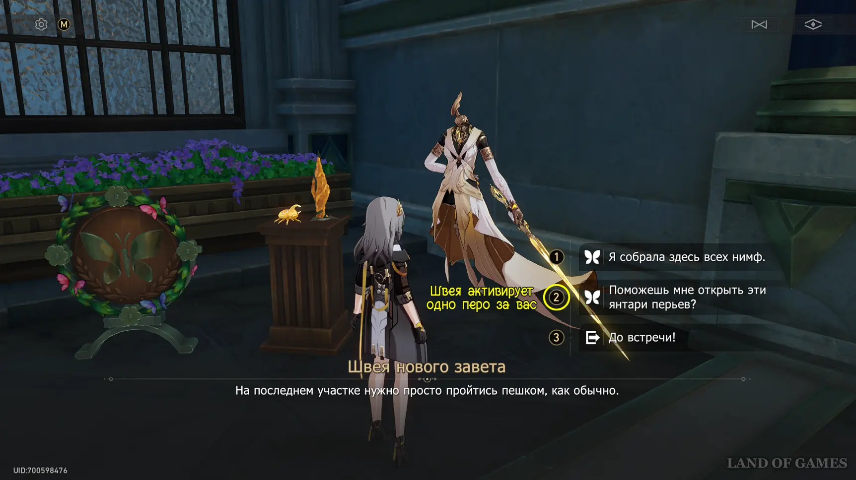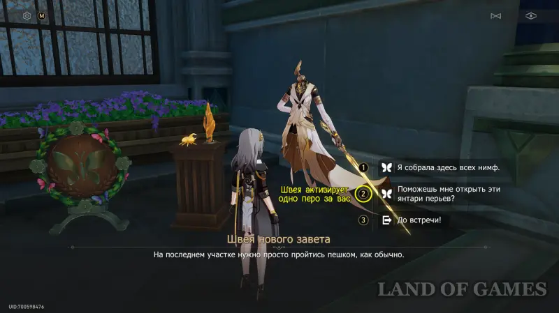Если вы собрали всех нимф, в диалоге со Швеей появится дополнительная реплика «Поможешь мне открыть эти янтари перьев?» — выбор приведет к тому, что одна из конструкций будет активирована дистанционно, следовательно идти до нее вам не придется.