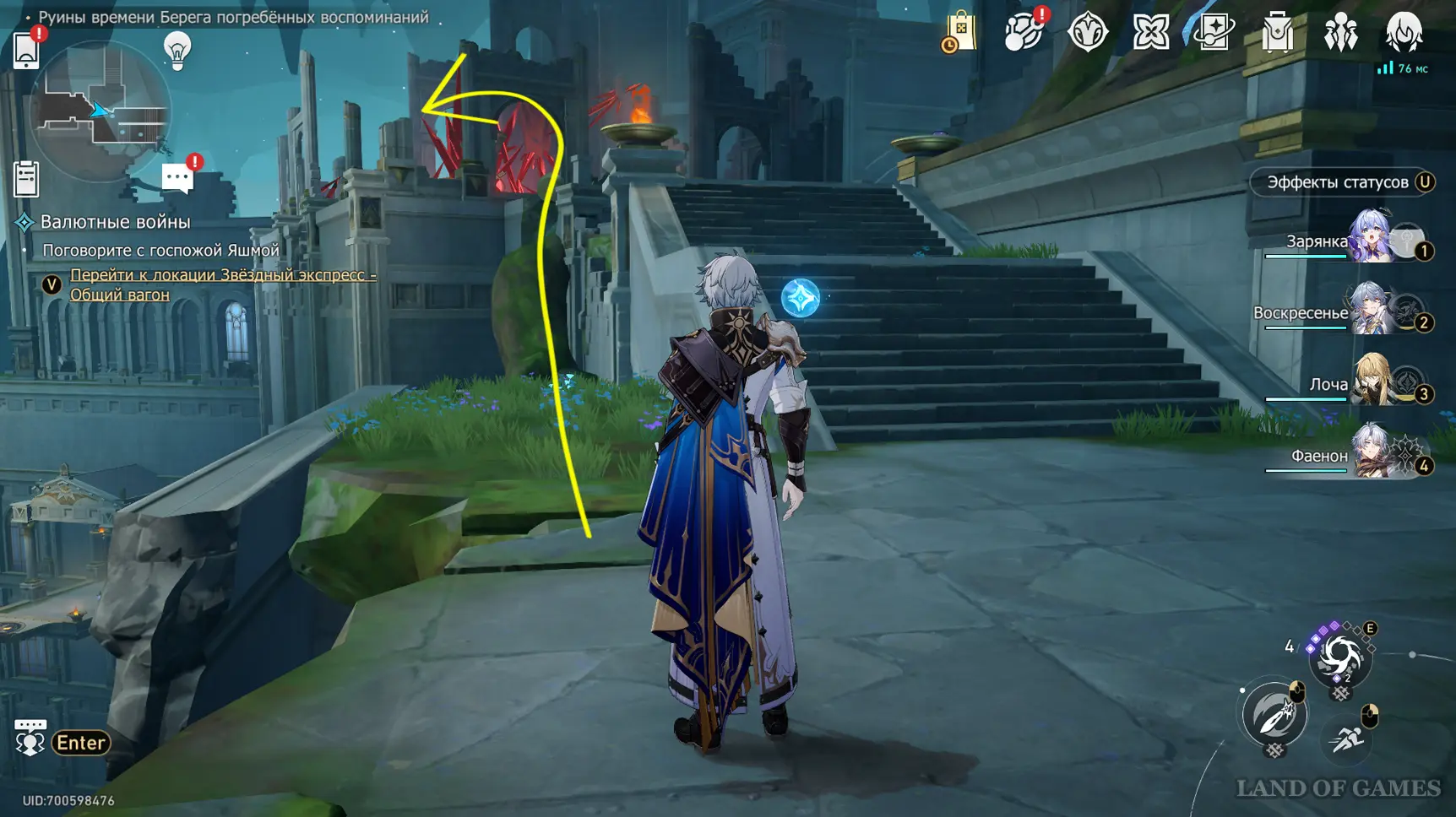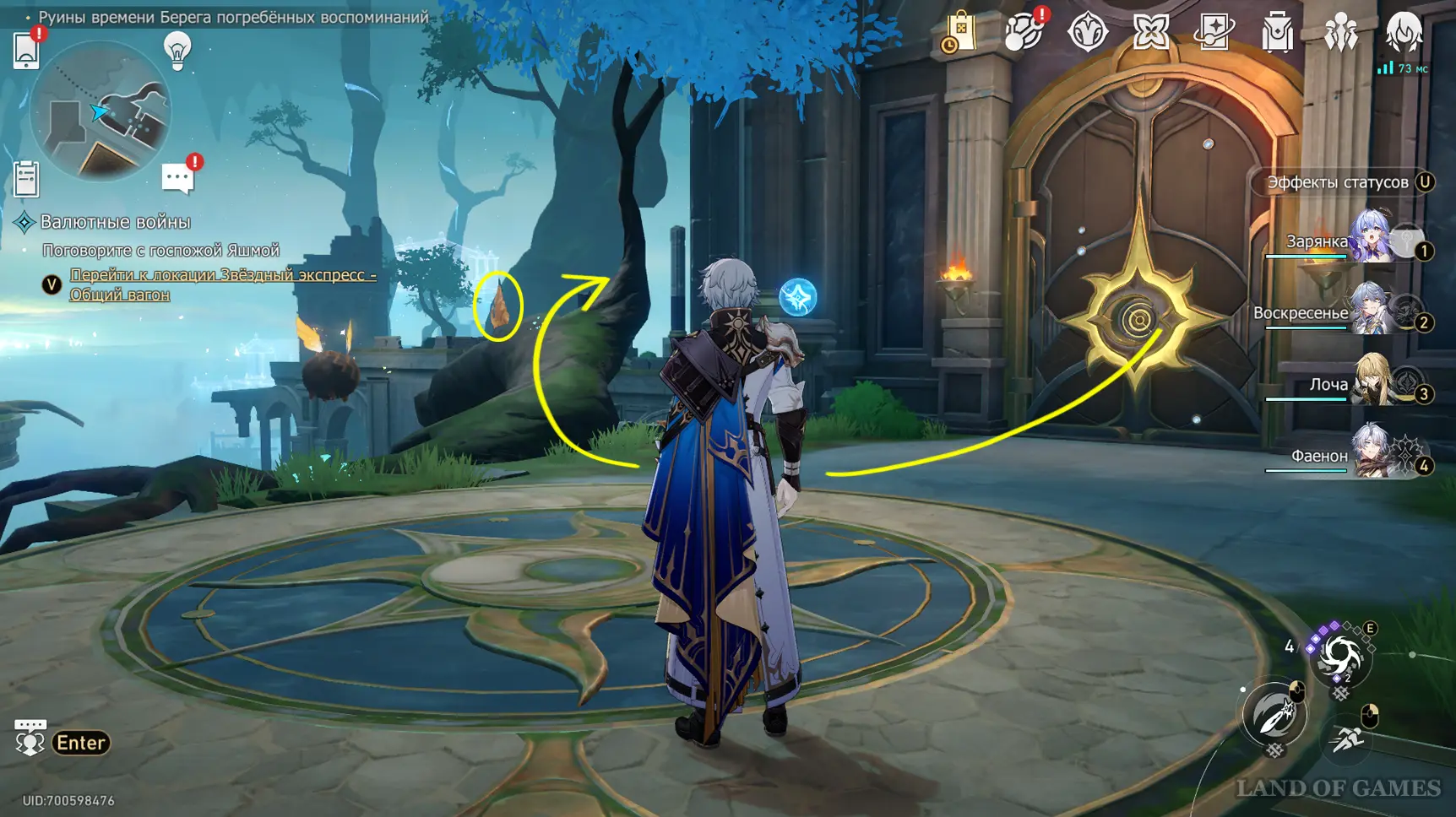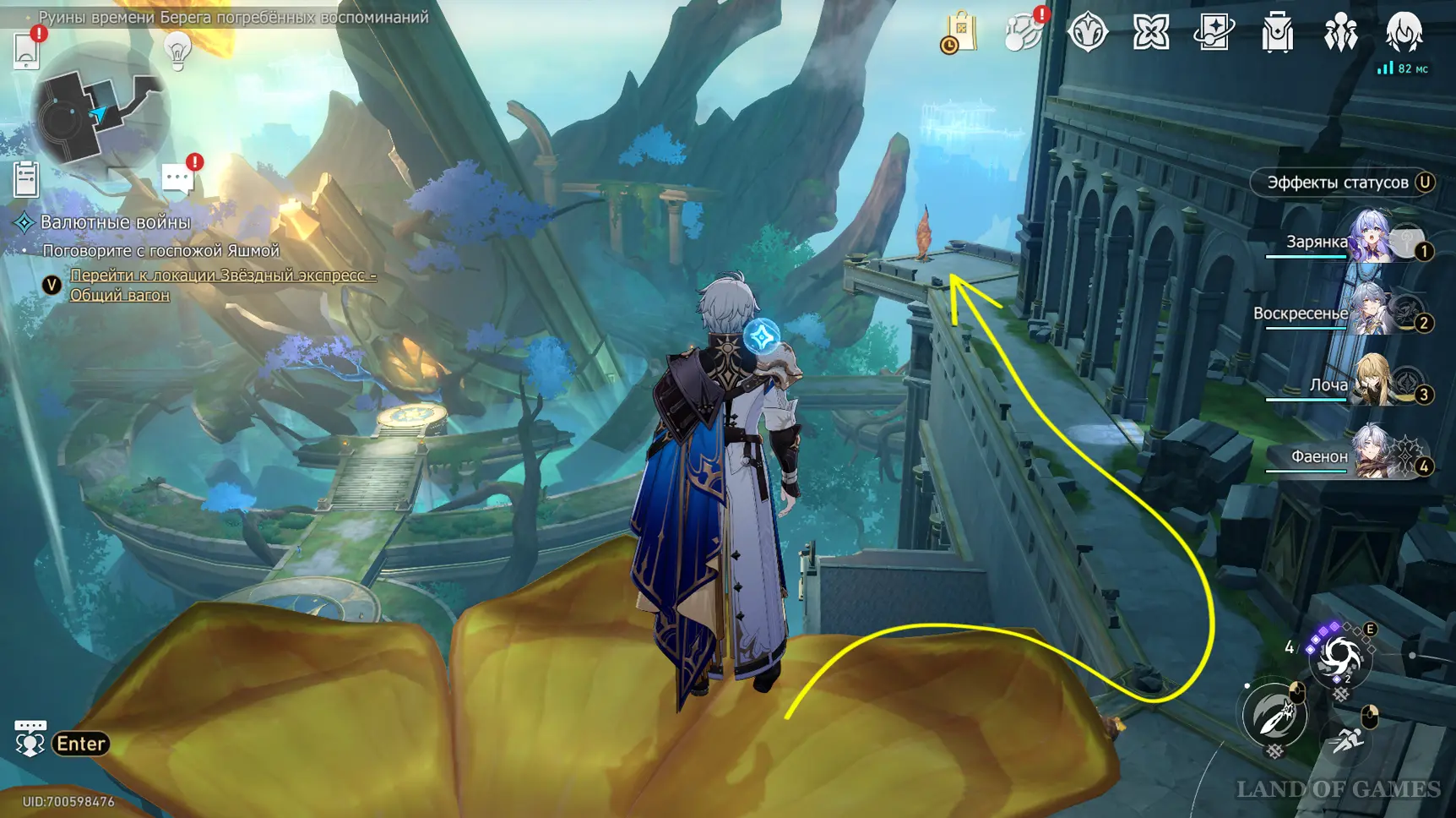 Поднимаемся на цветке и касаемся пера у края разрушенной площадки — первый луч запущен.