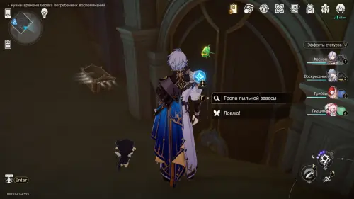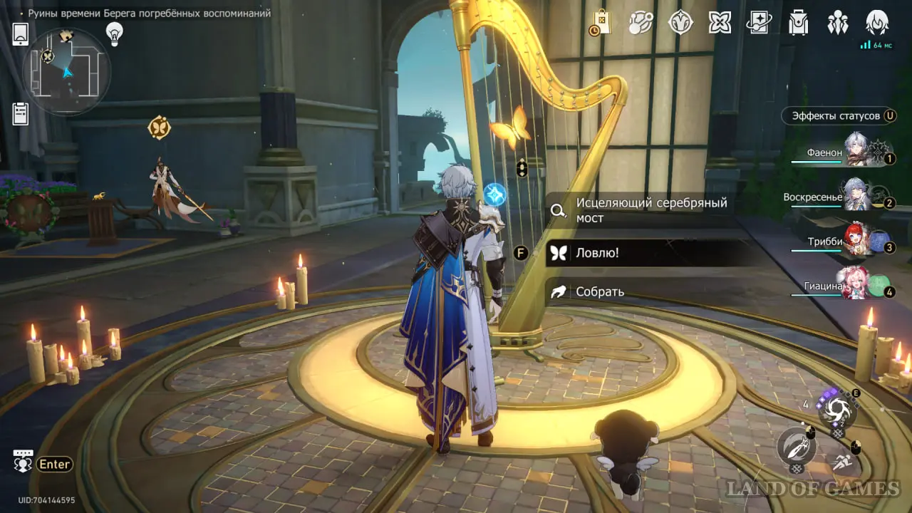 Телепортируйтесь к якорю «Галерея павшего острия» на -2 этаже. Идите на запад и пройдите в зал. Золотая бабочка музыки сидит на арфе.