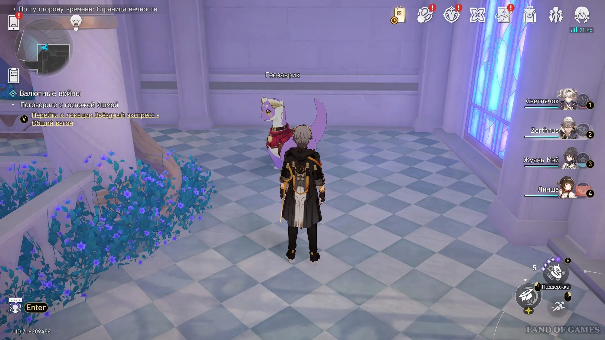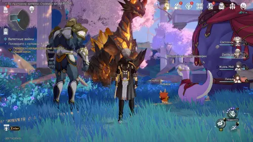 От фонтана пройдите немного направо и вперед, и в углу вы обнаружите Геозаврика (он может называться по другому в зависимости от вашего выбора в ивенте «Растим геозавра вместе!»). Поболтайте с ним и попросите сувенир на память – вы получите Статуэтку златиусов.