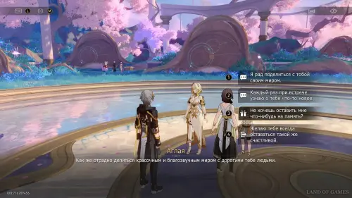 Далее переместитесь в Дворик грез и побеседуйте тут с Гиациной, Аглаей, Цифер и Анаксой. Опять же нужно сначала послушать их разговоры между собой, а потом пообщаться с каждым из них по отдельности для получения памятных декоров.
