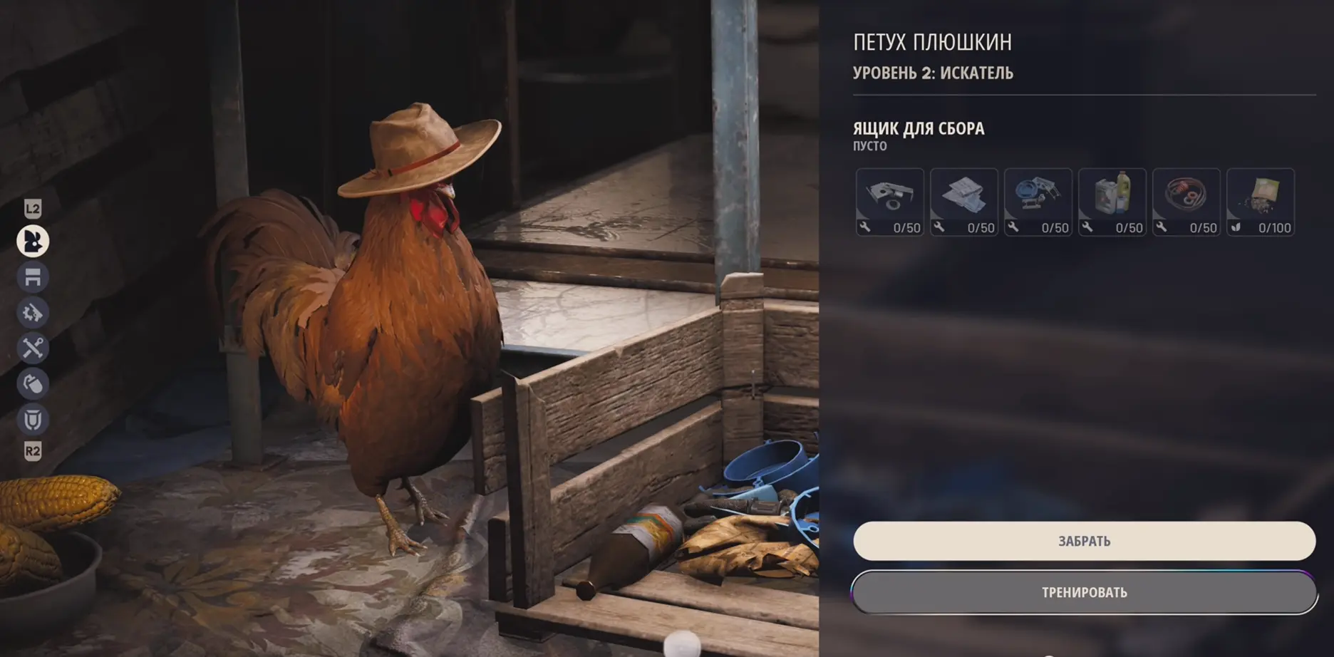 Чтобы улучшить Плюшкина, откройте мастерскую, выберите иконку петуха и нажмите «Тренировать». Каждый уровень требует определенных ресурсов, а с ростом уровня повышается скорость и объем добычи.