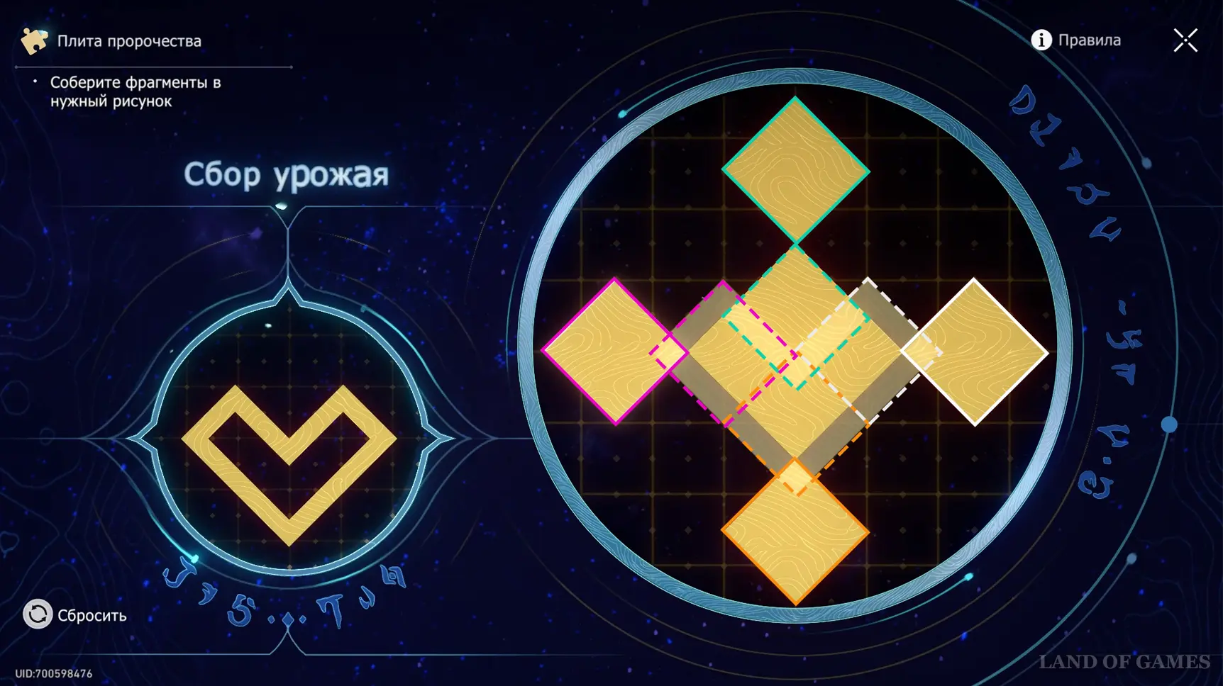 Для корректной реконструкции рисунка следуйте подсказкам и установите части плиты «Сбор урожая» так: