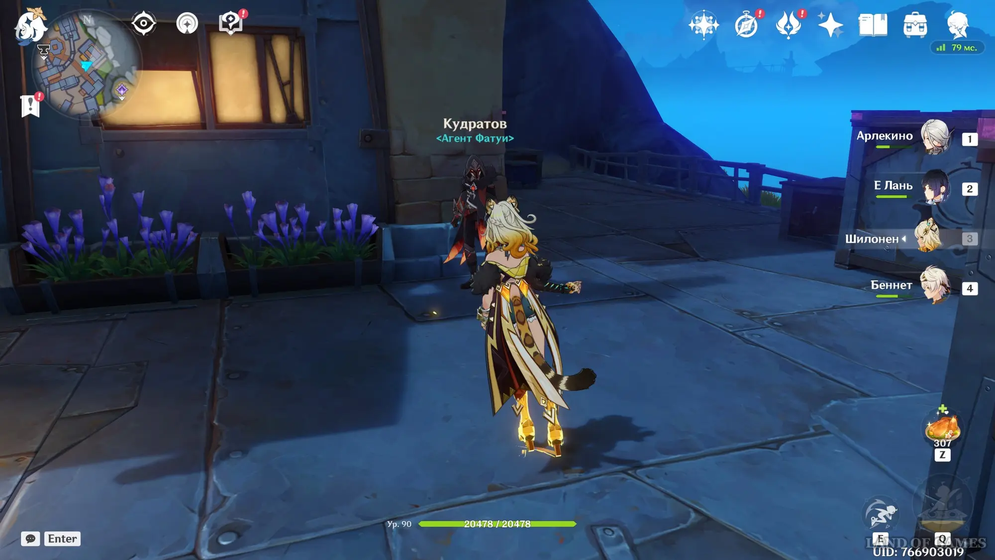После взаимодействия с мошенником, просто развернитесь, и вы заметите агента Фатуи рядом с углом здания. Несмотря на грозный вид и свою деятельность по выбиванию долгов, на самом деле он трусишка.