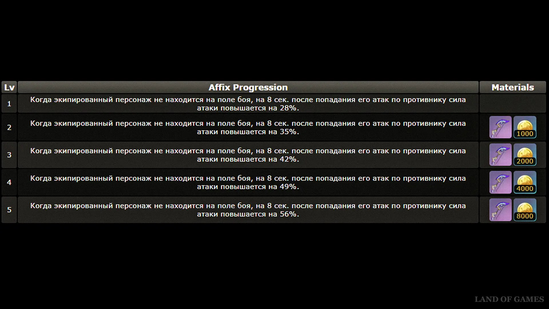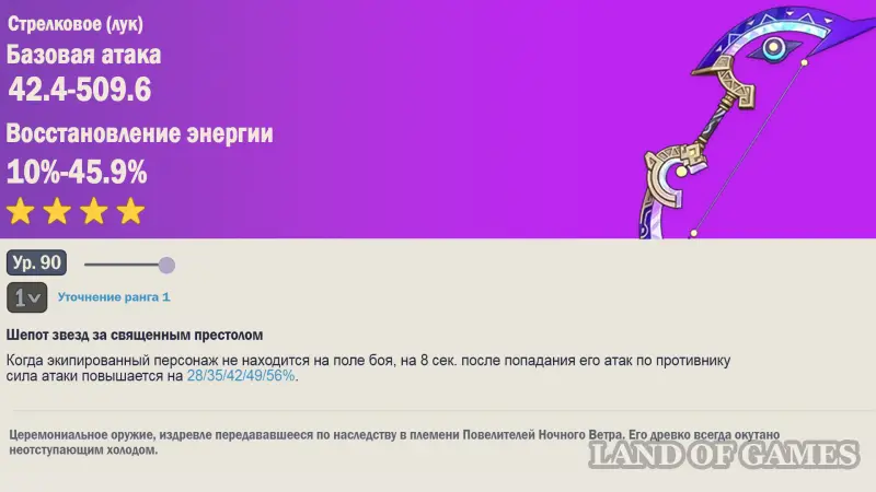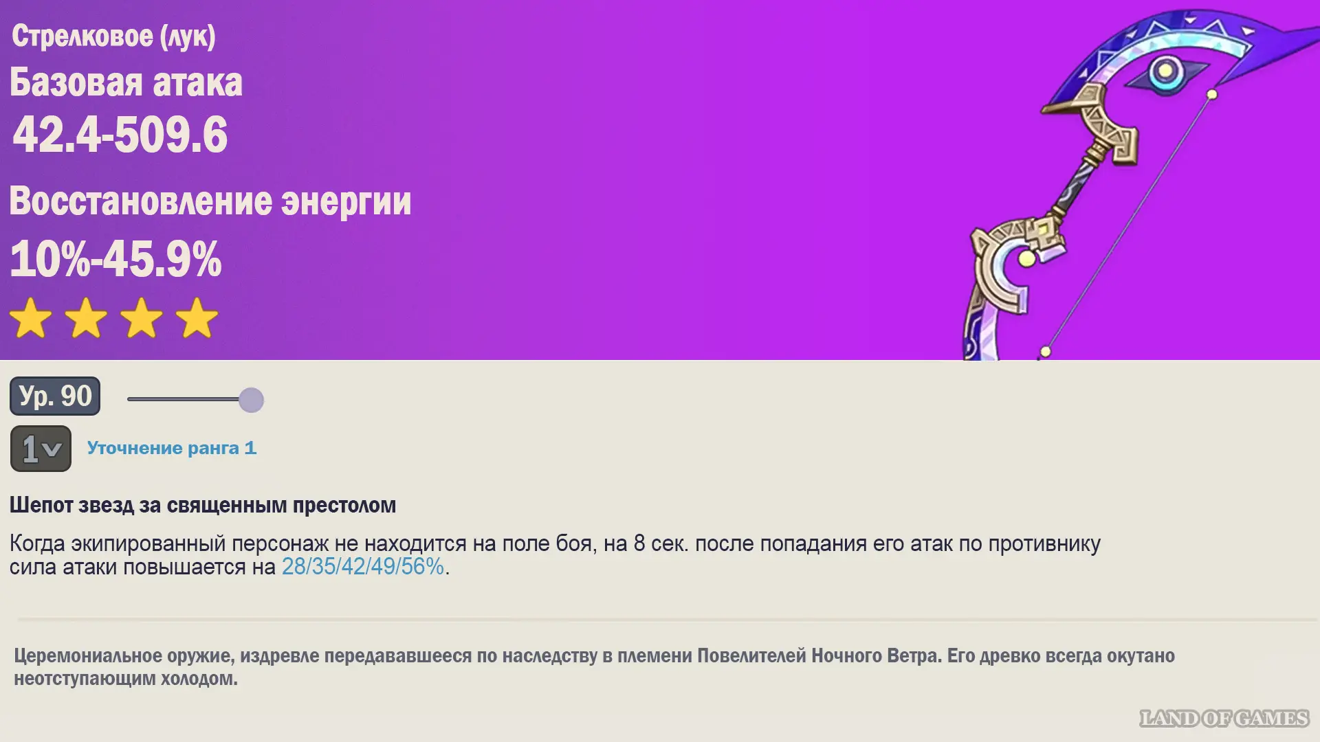Пассивка «Шепот звезд за священным престолом» активируется следующим образом: после того как атаки владельца лука задевают цель, его сила атаки получает прирост в 28/35/42/49/56%. Бафф активируется, только когда персонаж уходит с поля боя, и действует 8 секунд.
