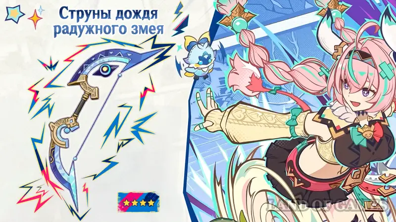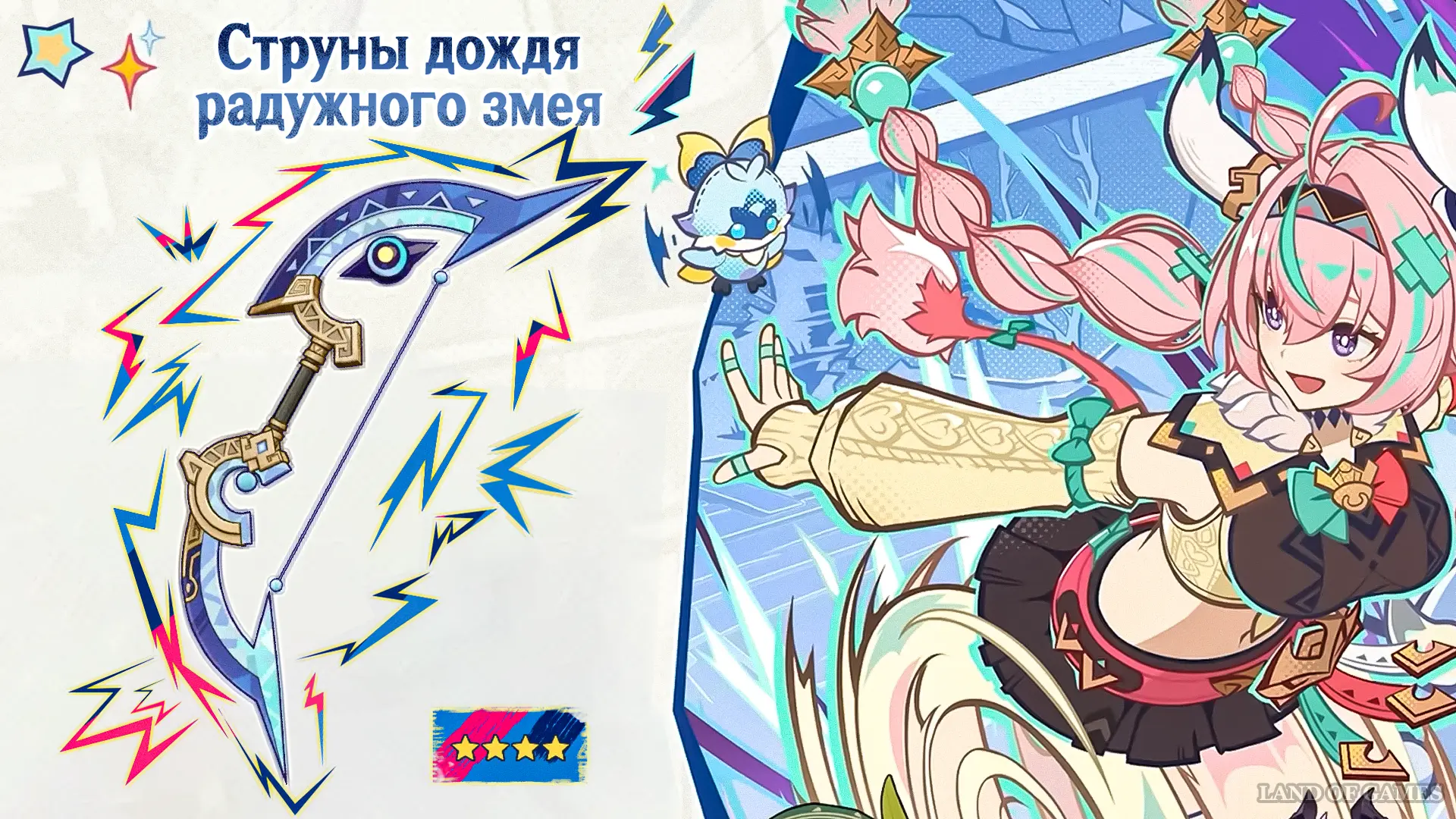 В Genshin Impact «Струны дождя радужного змея» — бесплатный эпический лук, доступный в рамках внутриигрового события версии 6.2. Дает бонус к восстановлению энергии и повышает показатель силы атаки носителя при игре из кармана. В этом гайде разберем, как получить и прокачать лук, а также каким героям он подходит.