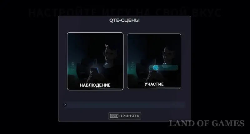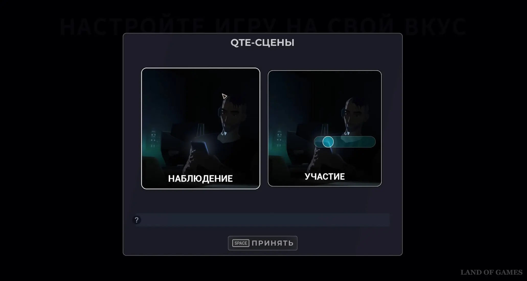 Примечание: Отметим, что если в начале игры выбрать «Наблюдение» для QTE-сцен, то при их появлении в игре они будут автоматически считаться успешно пройденными. Это касается и взломов, где можно включить неограниченное количество попыток.