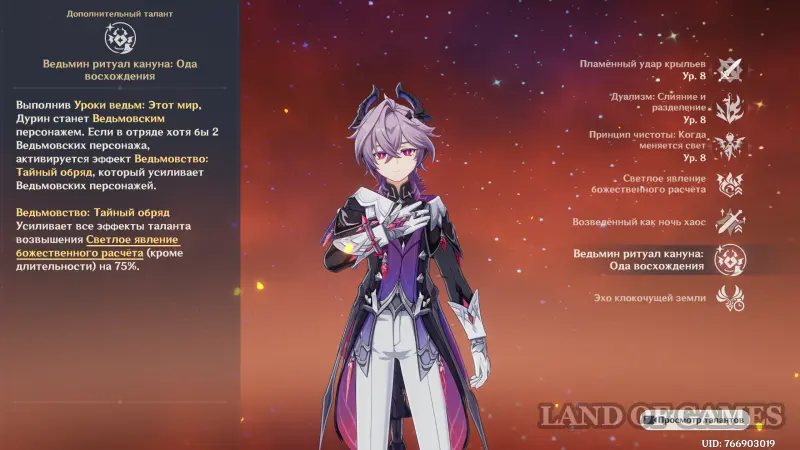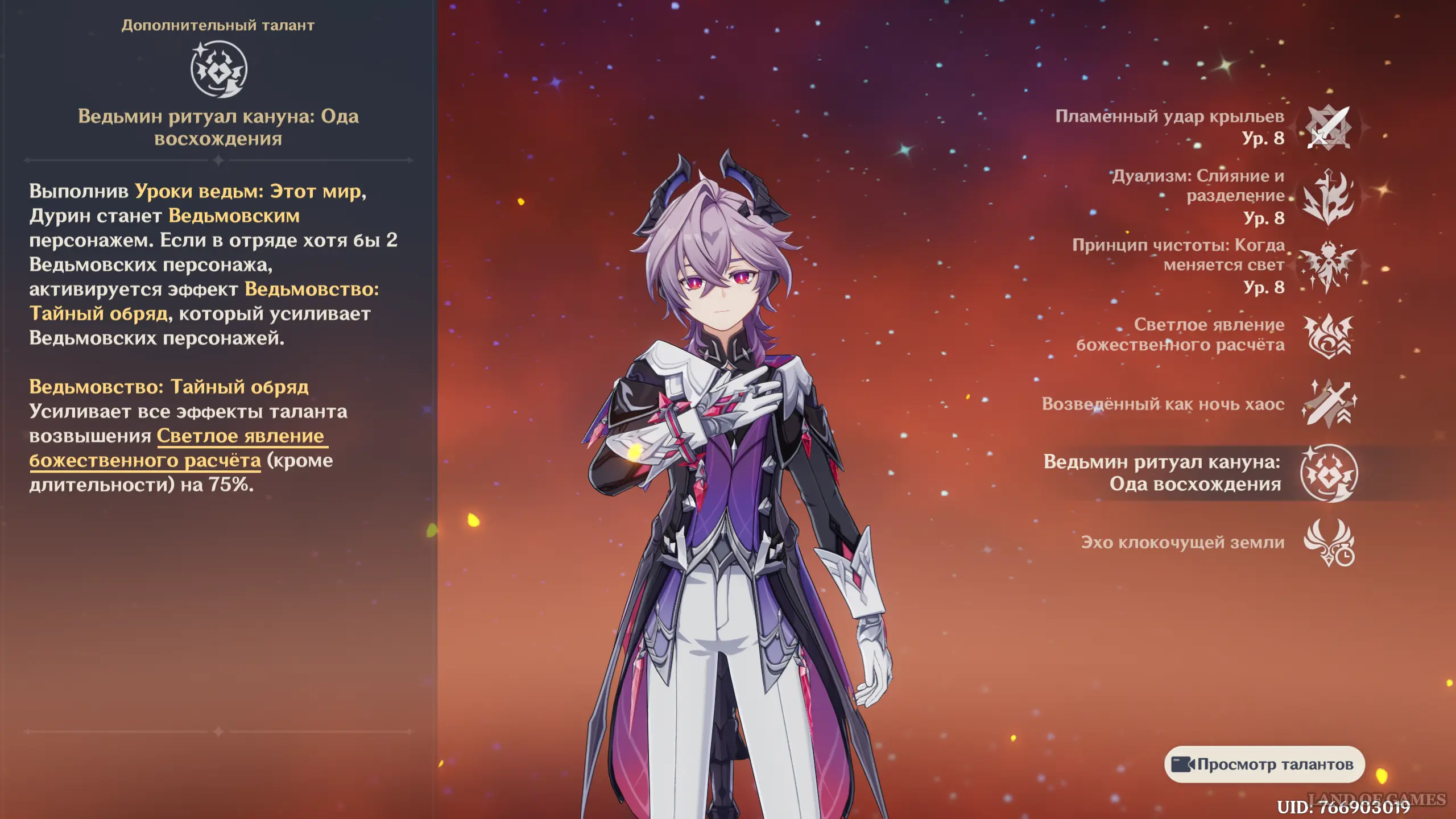 Дурин обладает уникальной пассивкой «Ведьмин ритуал кануна: Ода восхождения», которая активируется после выполнения Уроков ведьмы: Этот мир и при наличии в команде хотя бы двух ведьмовских персонажей. Она приводит к срабатыванию эффекта «Ведьмовство: Тайный обряд», который усиливает все эффекты (за исключением продолжительности) таланта «Светлое явление божественного расчета» на 75%.