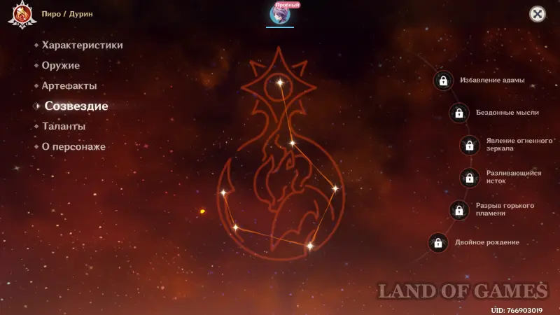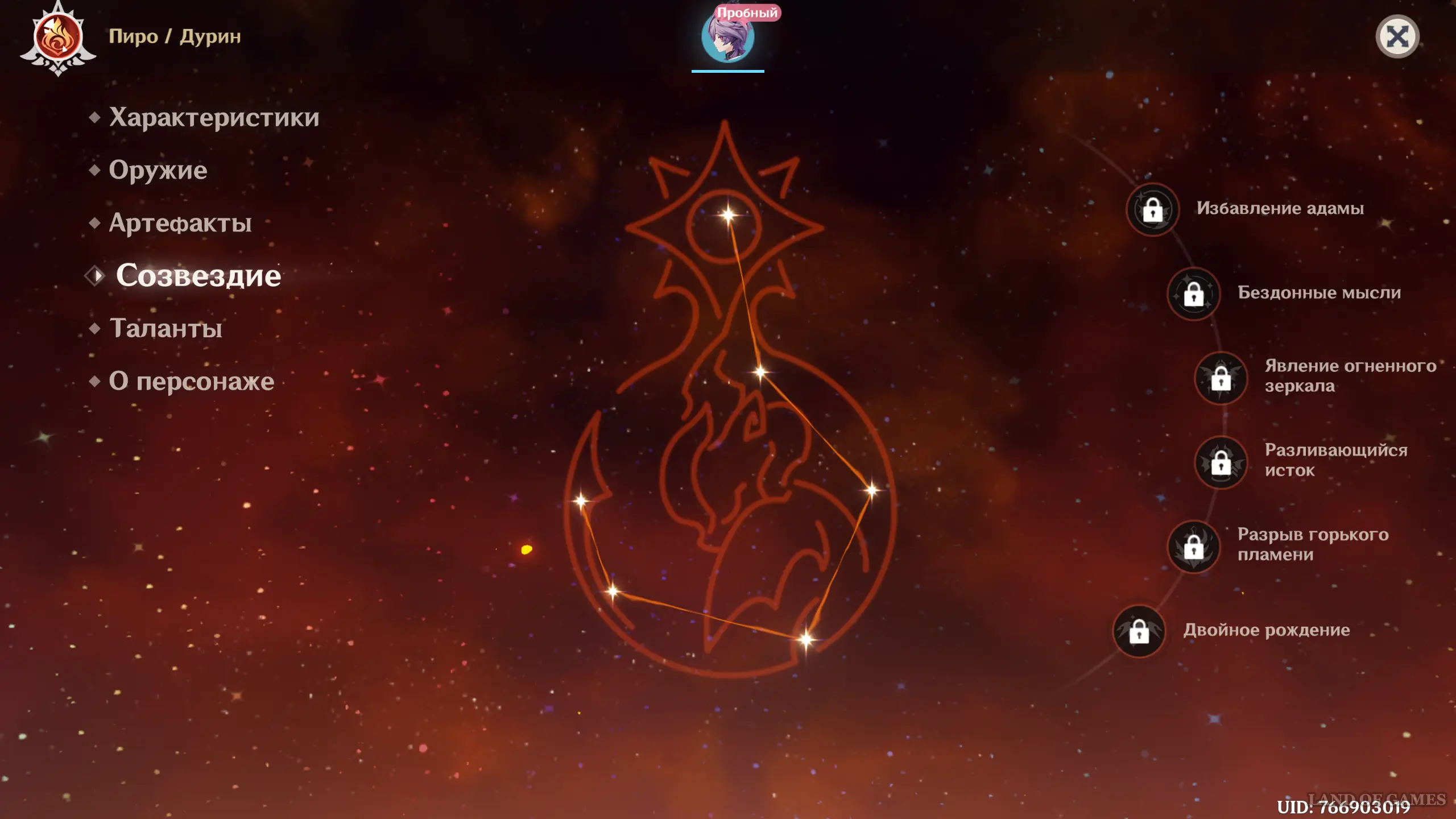 | Бездонные мысли | В течение 20 секунд после того, как используется ульта Дурина, и после того как союзники вызывают на противнике реакции Пар, Таяние, Горение, Перегрузка Пиро Рассеивание или Пиро Кристалл, либо когда наносят Пиро или Дендро урон врагам со статусом Горение, то Пиро урон и урон участвовавших в реакциях элементов персонажей отряда поблизости повышается на 50% на 6 секунд. | Еще одно отличное созвездие, которое дает поистине огромный стихийный бонус Дурину и основному дамагеру, вне зависимости от его элемента (главное, чтобы он тоже был задействован в реакции). |