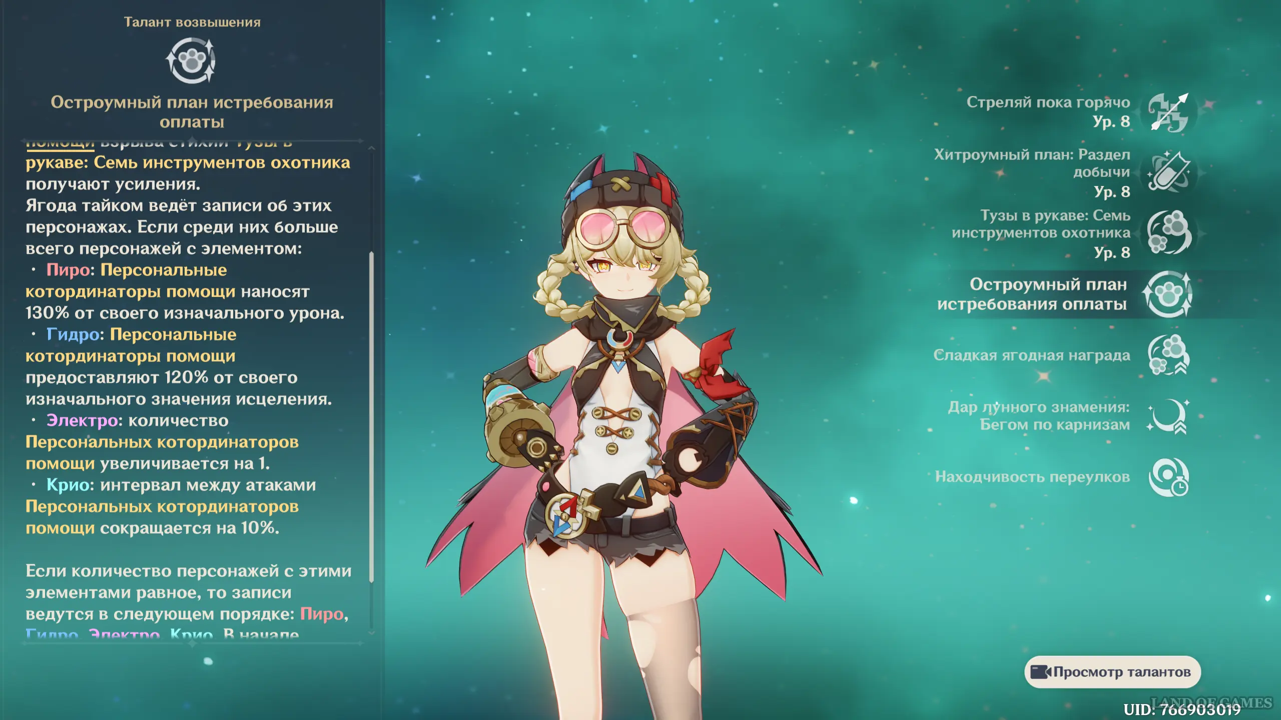 Примечание: Если у активного персонажа здоровье превышает 70%, то котординаторы будут также лечить союзника с наименьшим текущим HP в отряде в размере 55% от силы атаки Ягоды + 424 единицы. Плюс, у этого активного героя повысится мастерство стихий на 100 единиц на 6 секунд.