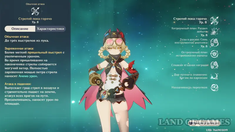 При выполнении обычного удара героиня осуществляет до 3-х выстрелов из лука, а заряженной – совершает прицельный выстрел с повышенным дамагом. При прицеливании заряжает ветром наконечник стрелы и в случае полного заряда наносит Анемо урон. Во время выполнения атаки в падении она выпускает град стрел, которые после приземления героя наносят повреждения по области.