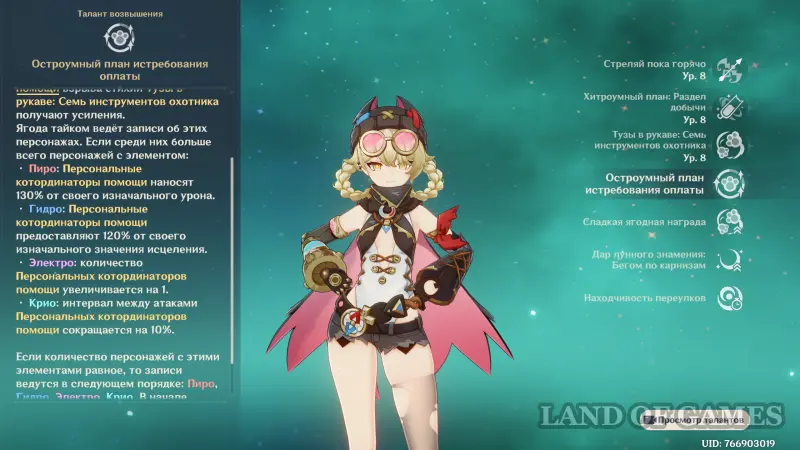 Длительность фляги составляет 20 секунд, то есть она успеет запустить 10 котошариков, общий множитель которых составит 2300%, что весьма немало, поэтому Ягоду вполне можно считать полноценным саб-ДД. Тип элементального урона зависит же от того, какую стихию поглотила фляга у врагов. Если на них навешено несколько статусов, то элемент выбирается в соответствии со следующим приоритетом: Пиро > Гидро > Электро > Крио.