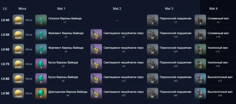 Добыть бирюзу Вайюда можно с Анемо гипостазиса, Двалина Ужаса Бури, Секи но Ками, Алгоритма полуизвечной матрицы оператора наблюдения и Магу Кэнки. Они также продаются в сувенирной лавке. Светящееся чешуйчатое перо выпадает с Лучезарного мотылька-призрака. Переносной подшипник является местной диковиной Нод-Края. В отдельном гайде мы указали его расположение.